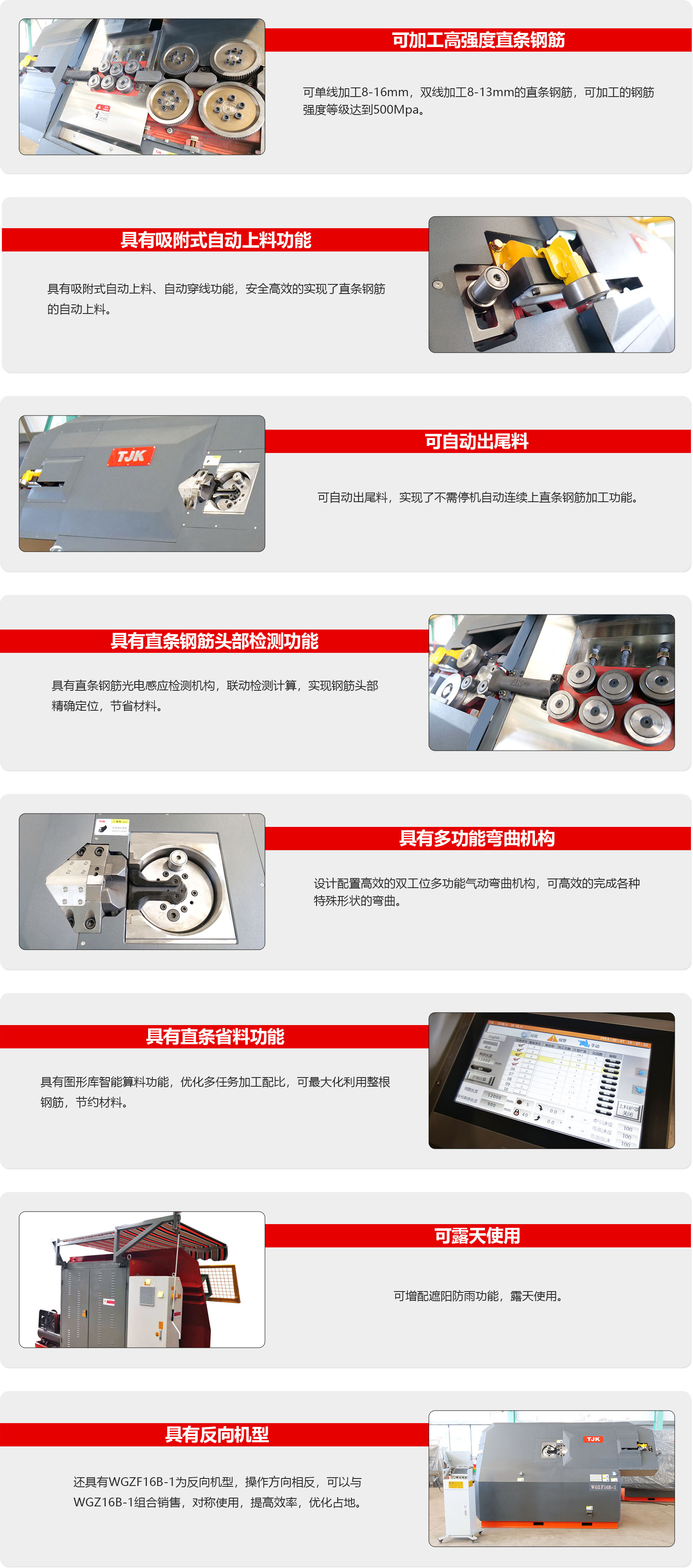 WGZ16B-1智能钢筋弯箍机器人是可自动的把直径(8-16)mm的直条钢筋加工成各种箍筋,具有自动送料检测功能,具有吸附式自动上料功能,可自动把钢筋从进料口送到主机里,省时省力,专业直条机型,可以最大化利用直条钢筋,省料,操作简单可靠。