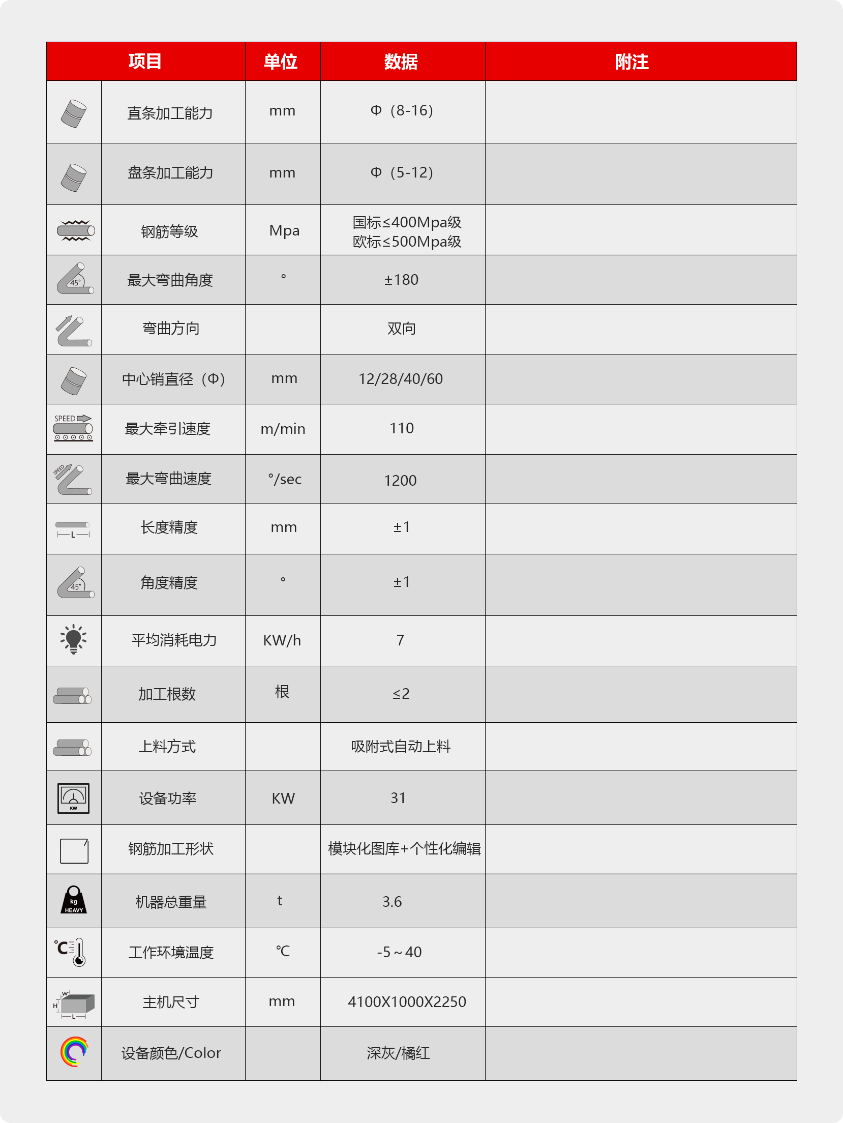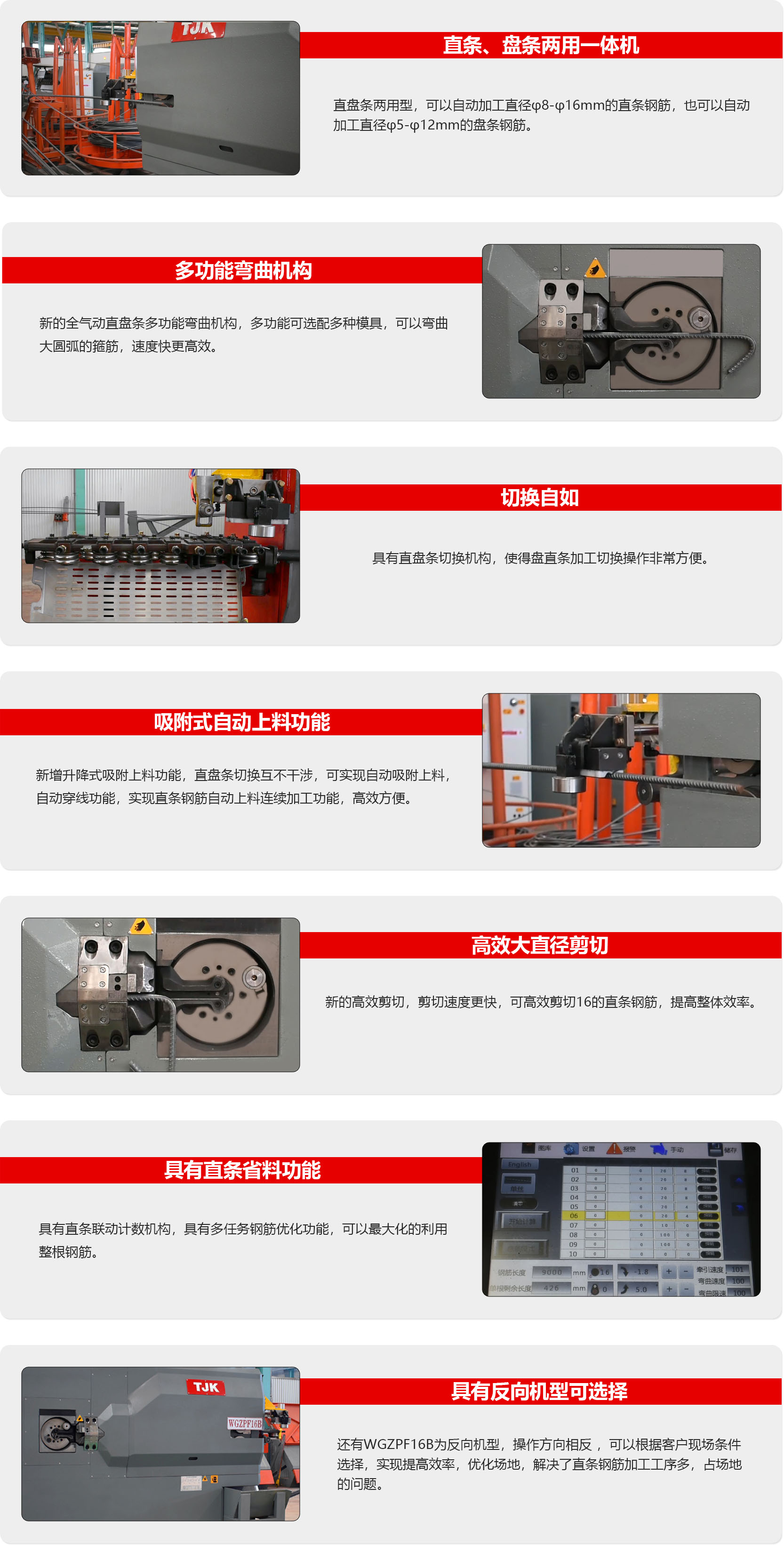 WGZP16B智能直盘条钢筋弯箍机器人为直盘条两用机型,可以自动加工直径φ8-φ16mm的直条钢筋,也可以自动加工直径φ5-φ12mm的盘条钢筋;新增升降式吸附上料功能,直盘条切换互不干涉,可实现自动吸附上料,自动穿线功能,具有直盘条切换机构,使得盘直条加工切换操作非常方便。