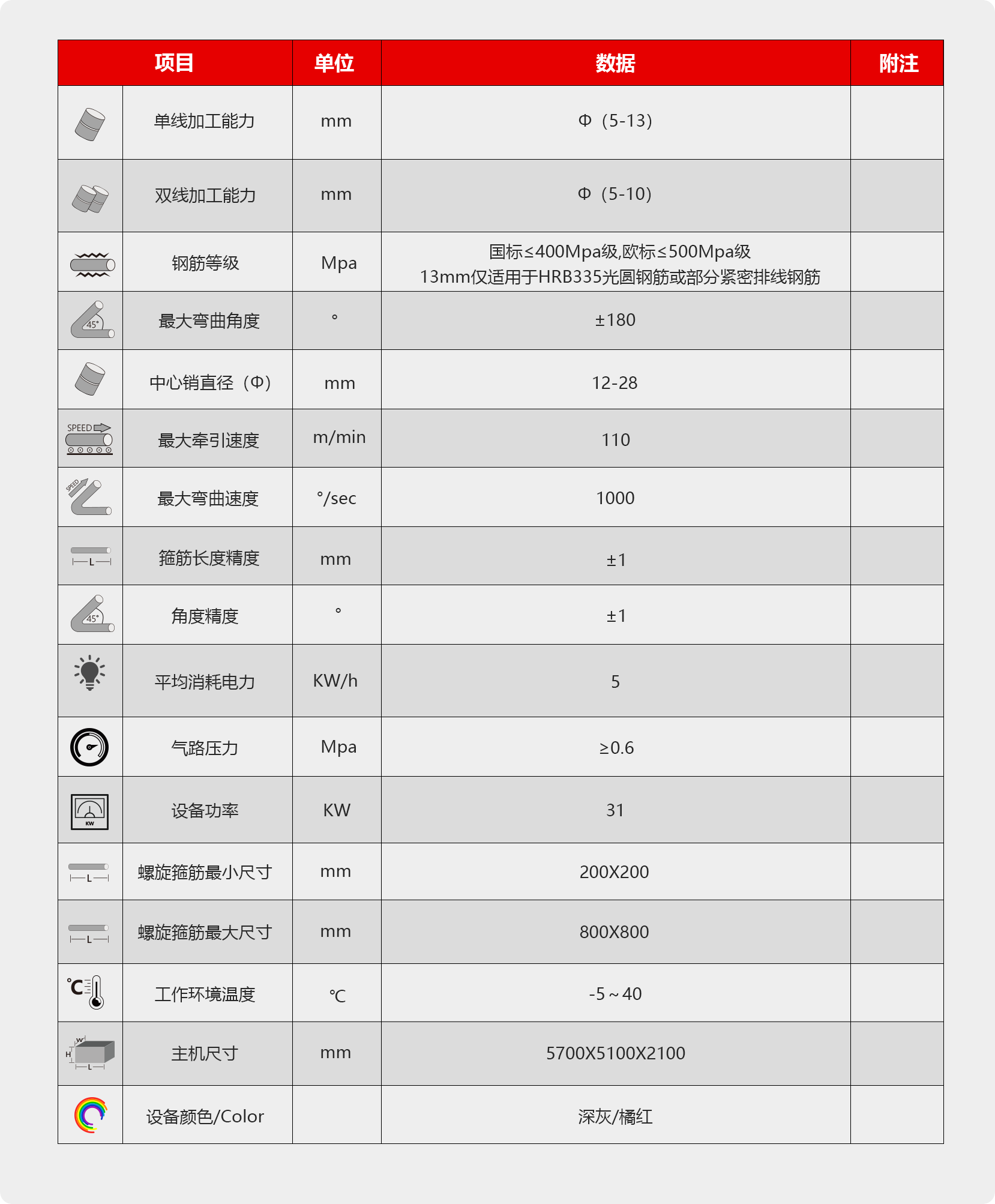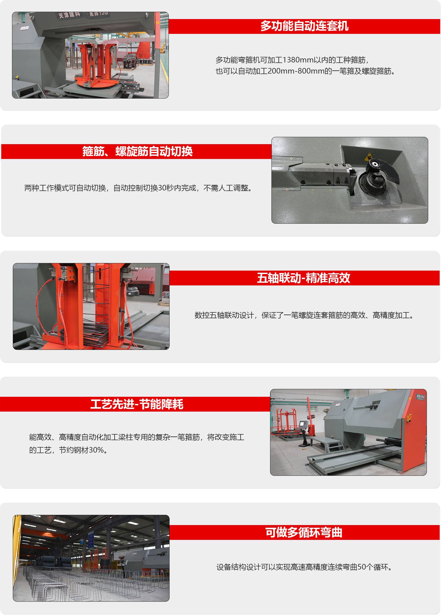 WG12G五轴智能联动弯箍机器人是可以自动的加工一般箍筋和螺旋一笔箍筋的多工能弯箍中心,主机工作模式可自动旋转切换,具有多轴联动的接料机构,具有强大的加工能力。用于主梁的螺旋箍筋加工,具有施工节省钢筋,结构强度高的优点。