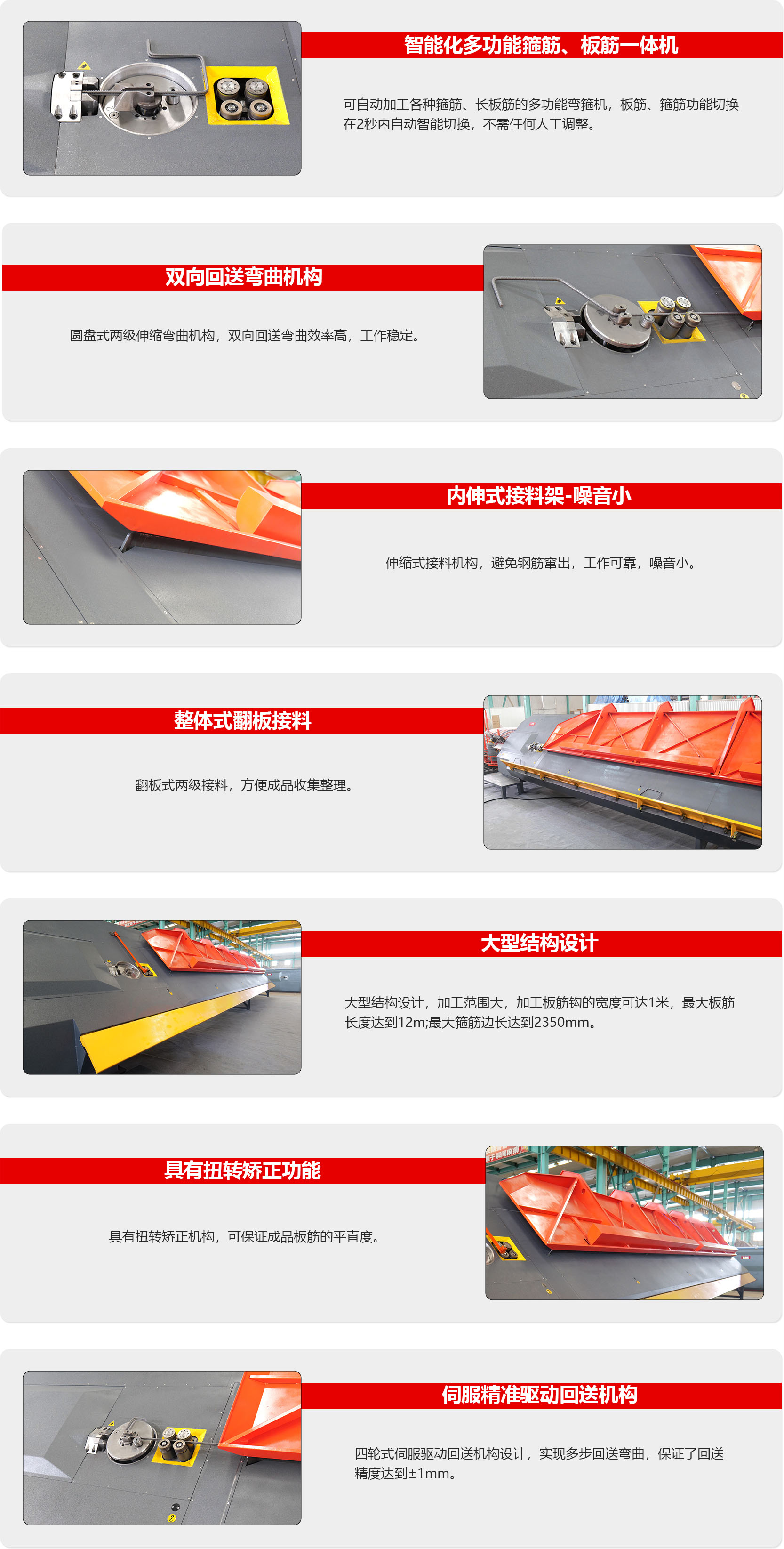 WG16F-2多功能智能钢筋弯箍机器人为大型多功能机型,可最大加工到16mm的盘条钢筋。既可以加工箍筋,又可以自动加工各种长板筋,伺服驱动的回送弯曲可以自动设置弯曲各种长度和角度的板筋钩,大型伸缩式接料机构设计,加工范围大,具有防扭转矫正机构,保证了成品的精度和平整度。一机多能,大量应用于钢筋加工配送工厂。