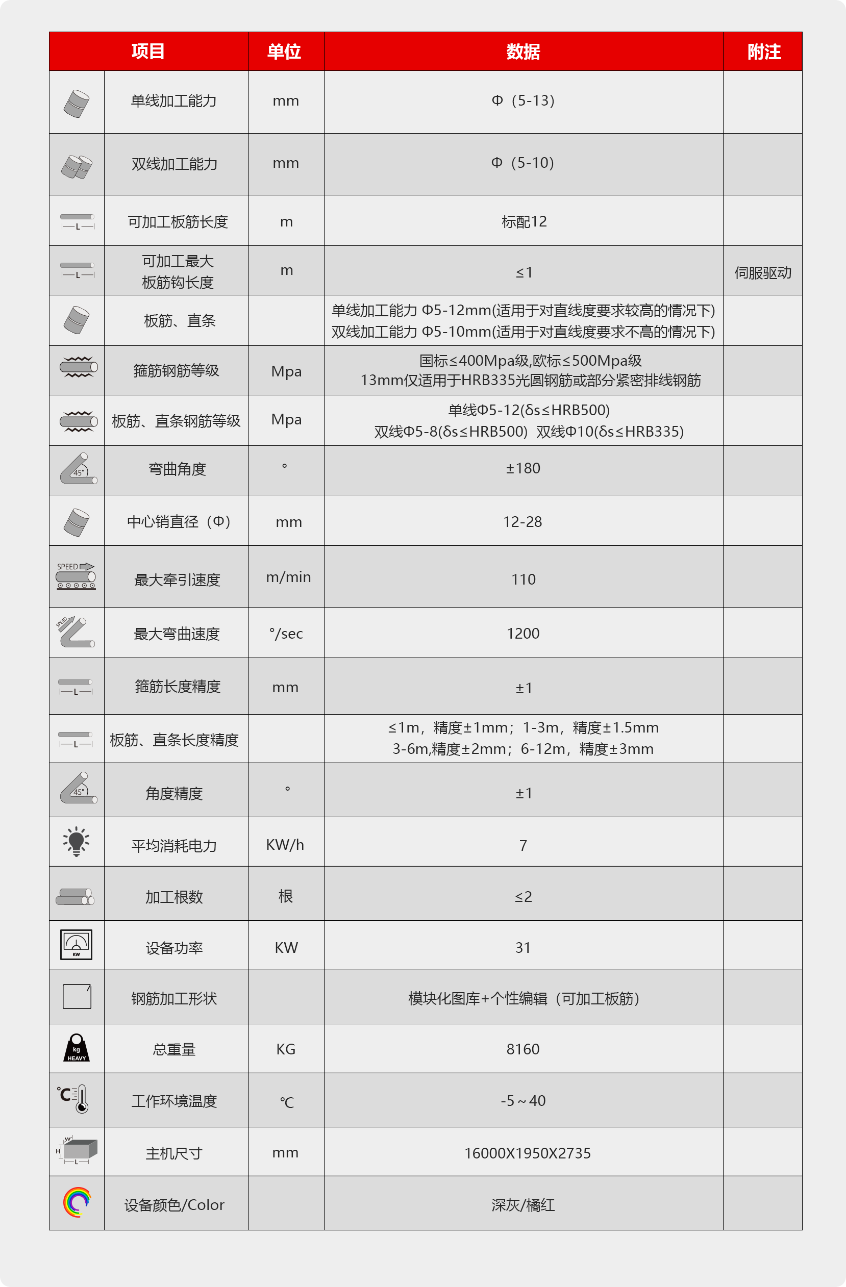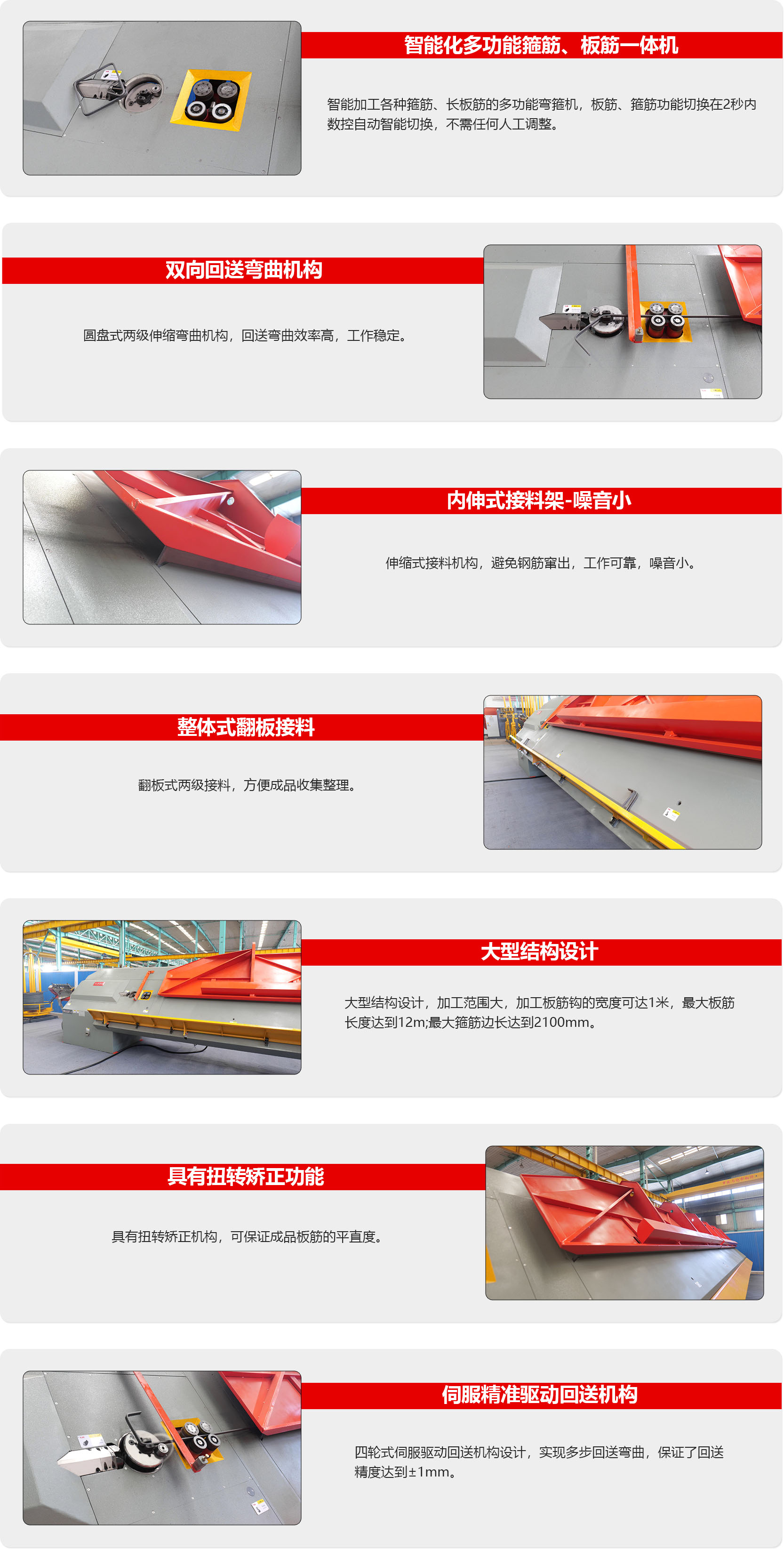 WG12F-1多功能智能钢筋弯箍机器人为一款大型多功能机型,既可以加工箍筋,又可以自动加工各种长板筋,伺服驱动的回送弯曲可以自动设置弯曲各种长度和角度的板筋钩, 大型伸缩式接料机构设计,加工范围大,具有防扭转矫正机构,保证了成品的精度和平整度。 一机多能,大量应用于钢筋加工配送工厂。