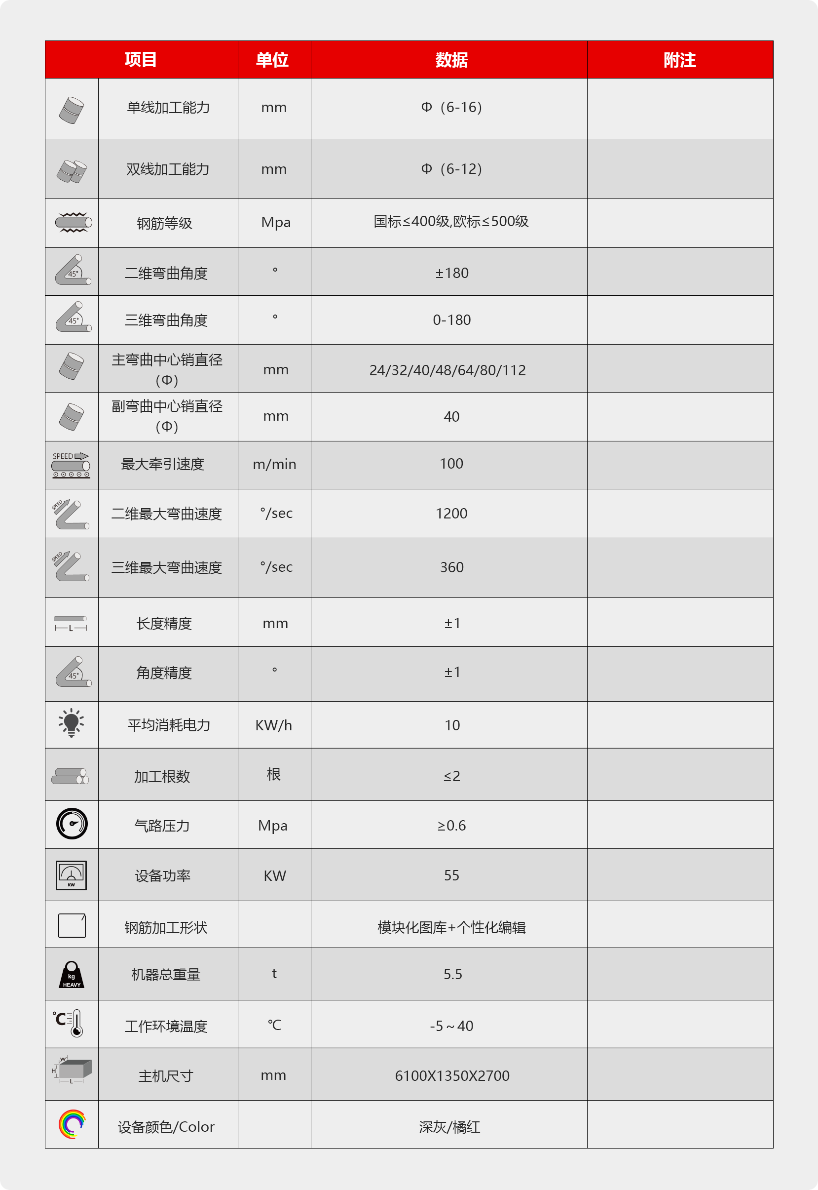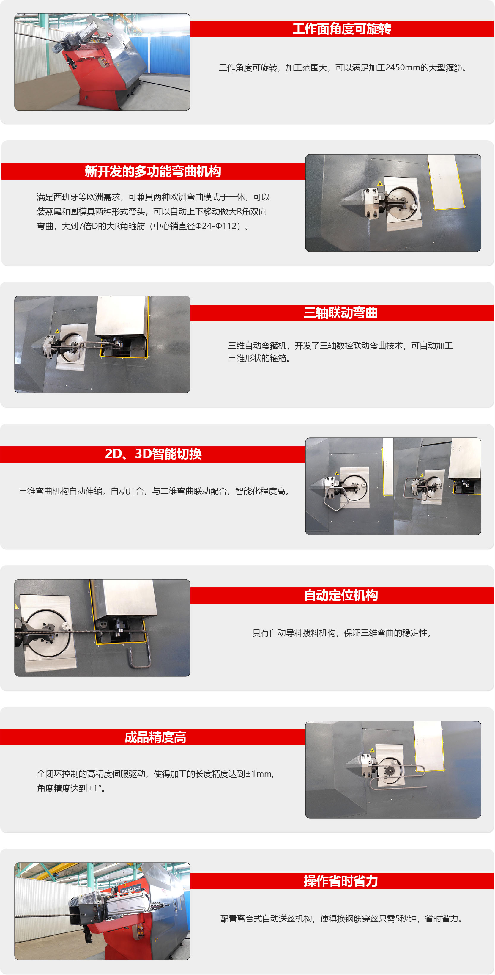 WG3D16B-2三维智能钢筋弯箍机器人是一款既可以加工平面箍筋,又可以加工立体箍筋的多功能大型机,新开发的多功能、双工位弯曲,集所有弯曲功能优势于一体,是兼 具欧洲两种主流弯曲模式优点的完美结合,可双向弯曲欧标大R角。开发了三轴数控联动弯曲技术,可自动加工三维形状的箍筋。一台设备可以满足工程需要的各种平面箍筋及立体 箍筋(如马凳筋)的加工。