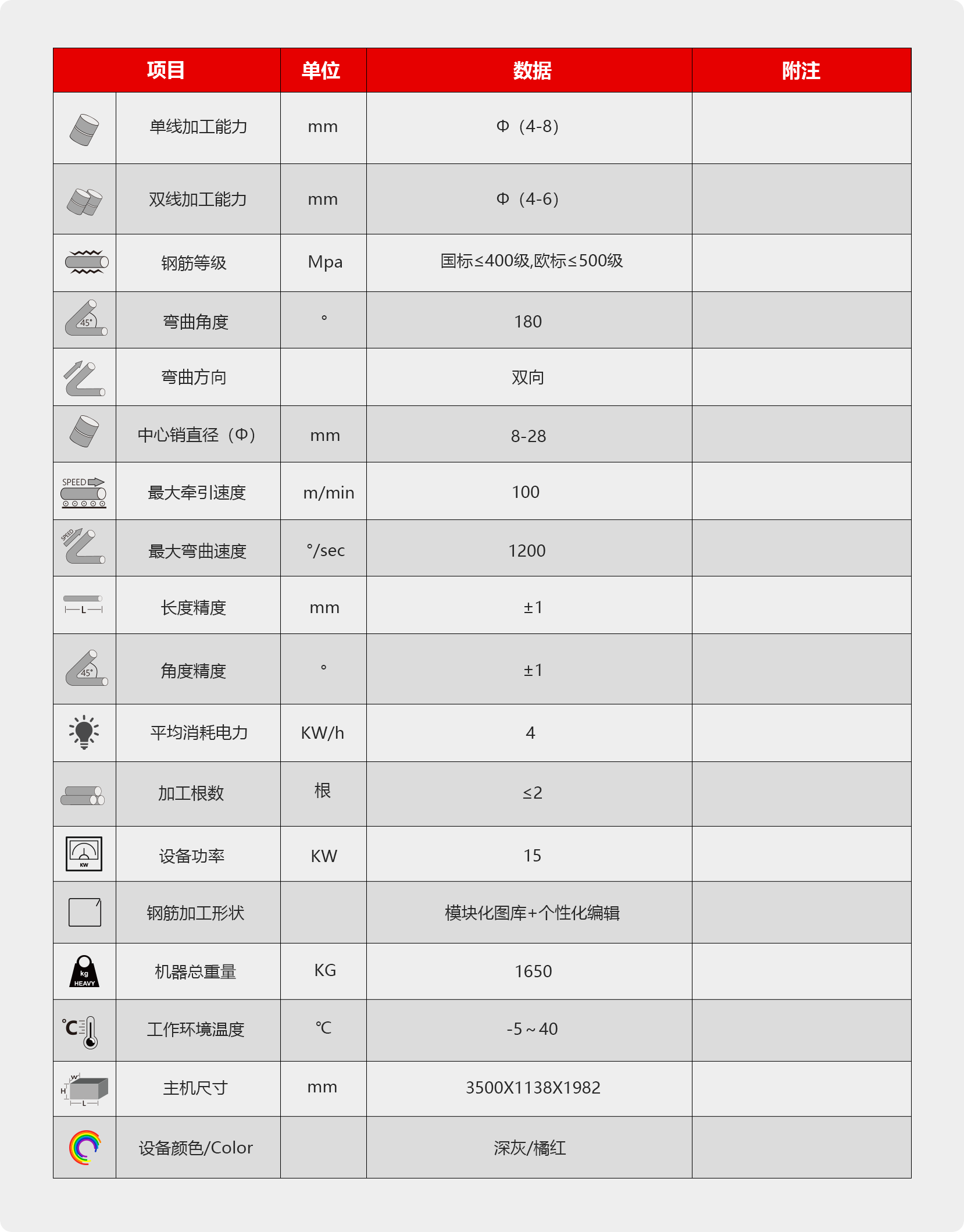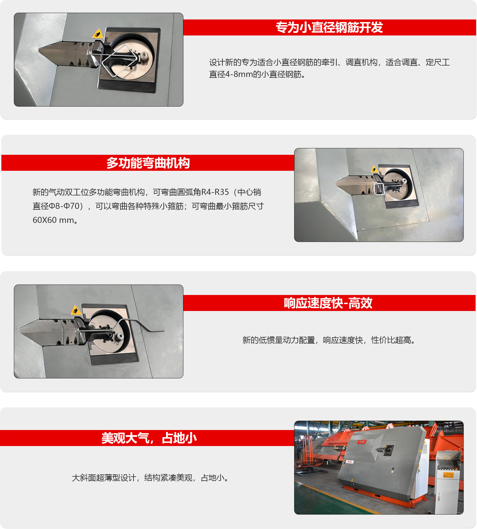 WG8智能钢筋弯箍机器人是一款专为适合小直径钢筋加工的盘条弯箍机。设计有适合小直径钢筋的专用牵引、调直、弯曲机构,可高效的弯曲4-8mm的小直径钢筋,可自动加工各种特殊形状的箍筋及小箍筋,使用操作简单,经济高效。