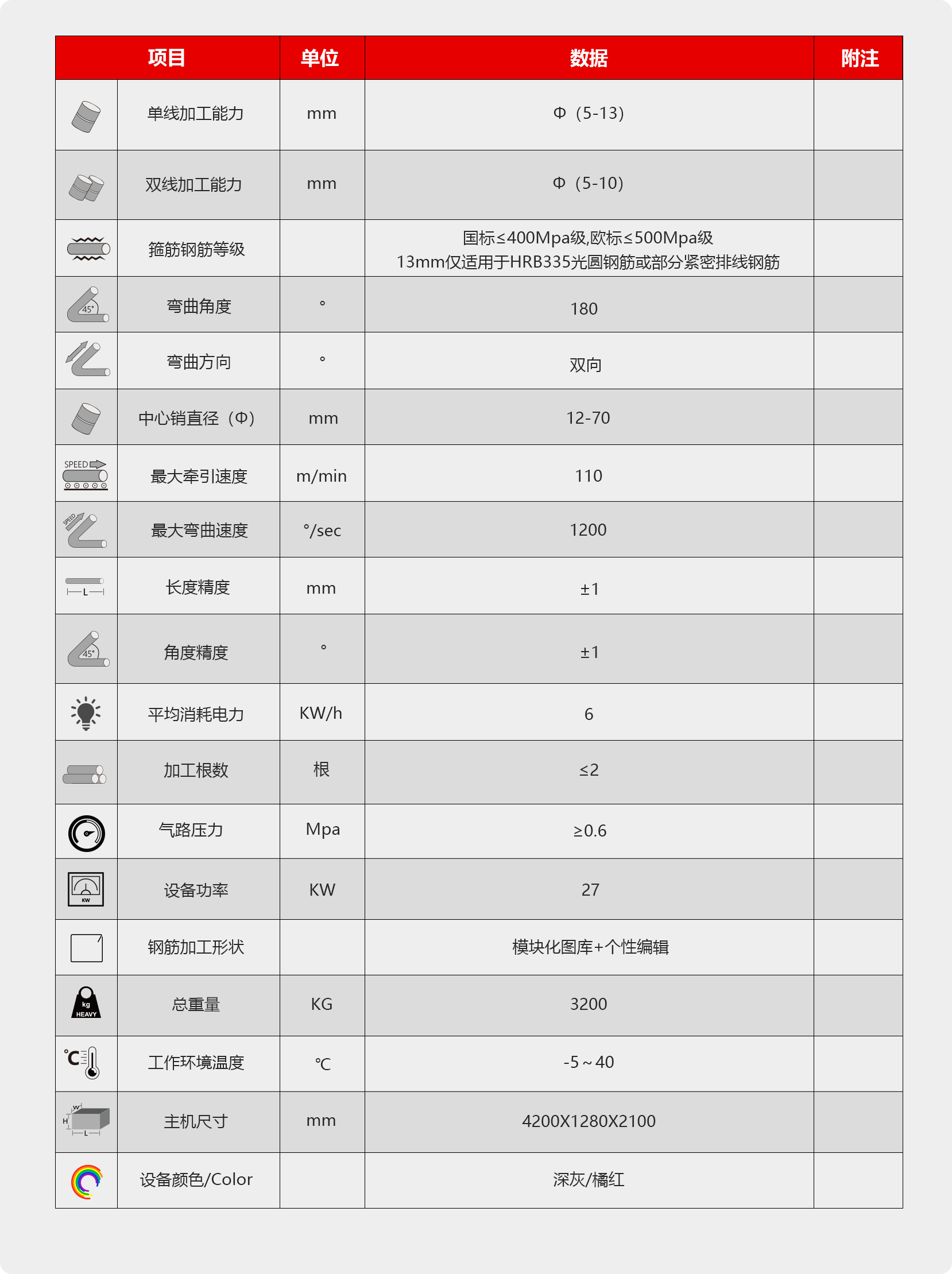 WG12E-2X智能钢筋弯箍机器人为大型斜面设计,加工范围大,高效的三工位多功能弯曲机构,可快速加工完成各种特殊形状的弯曲,可弯曲圆弧角R6-R35(中心销