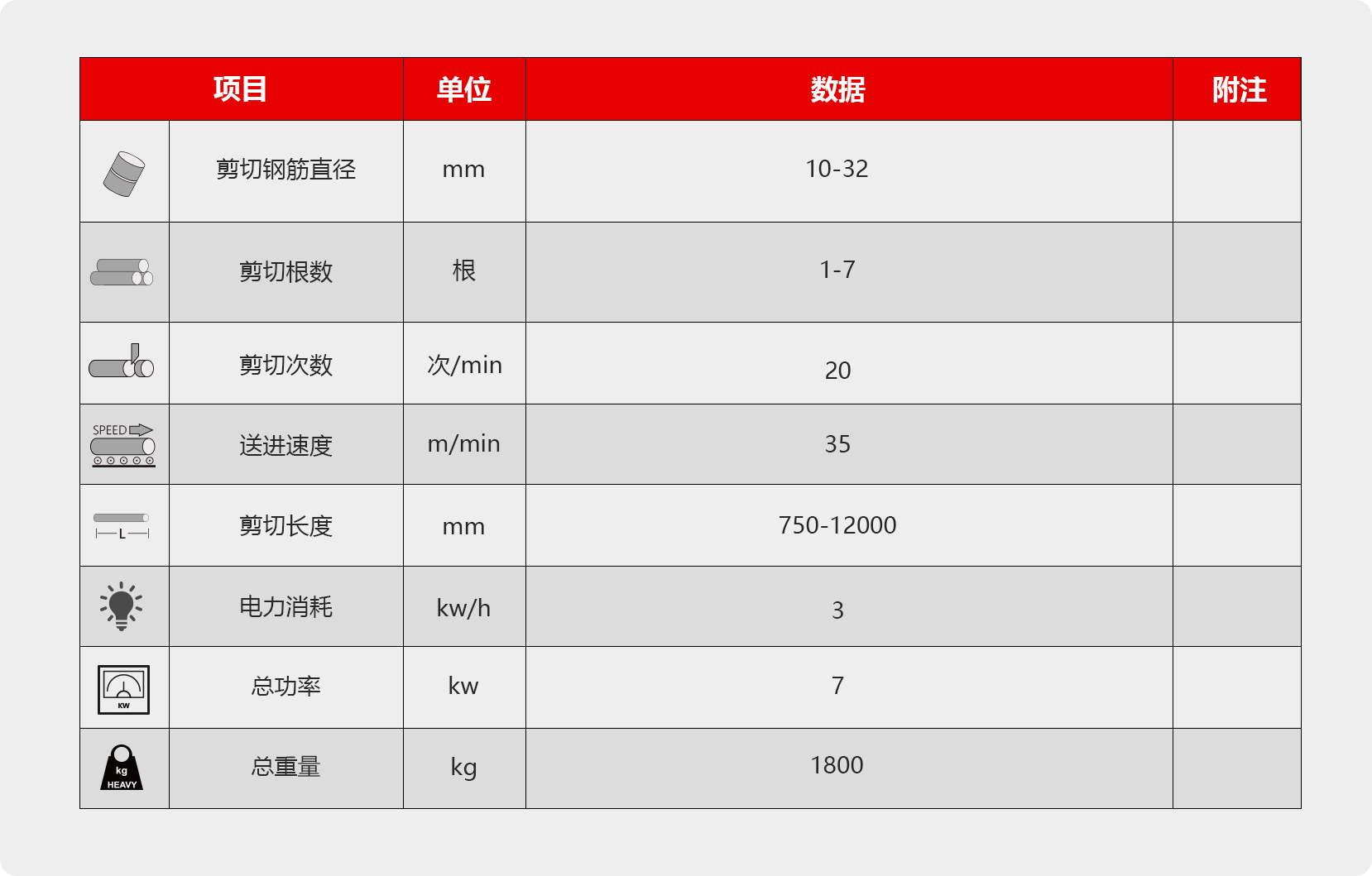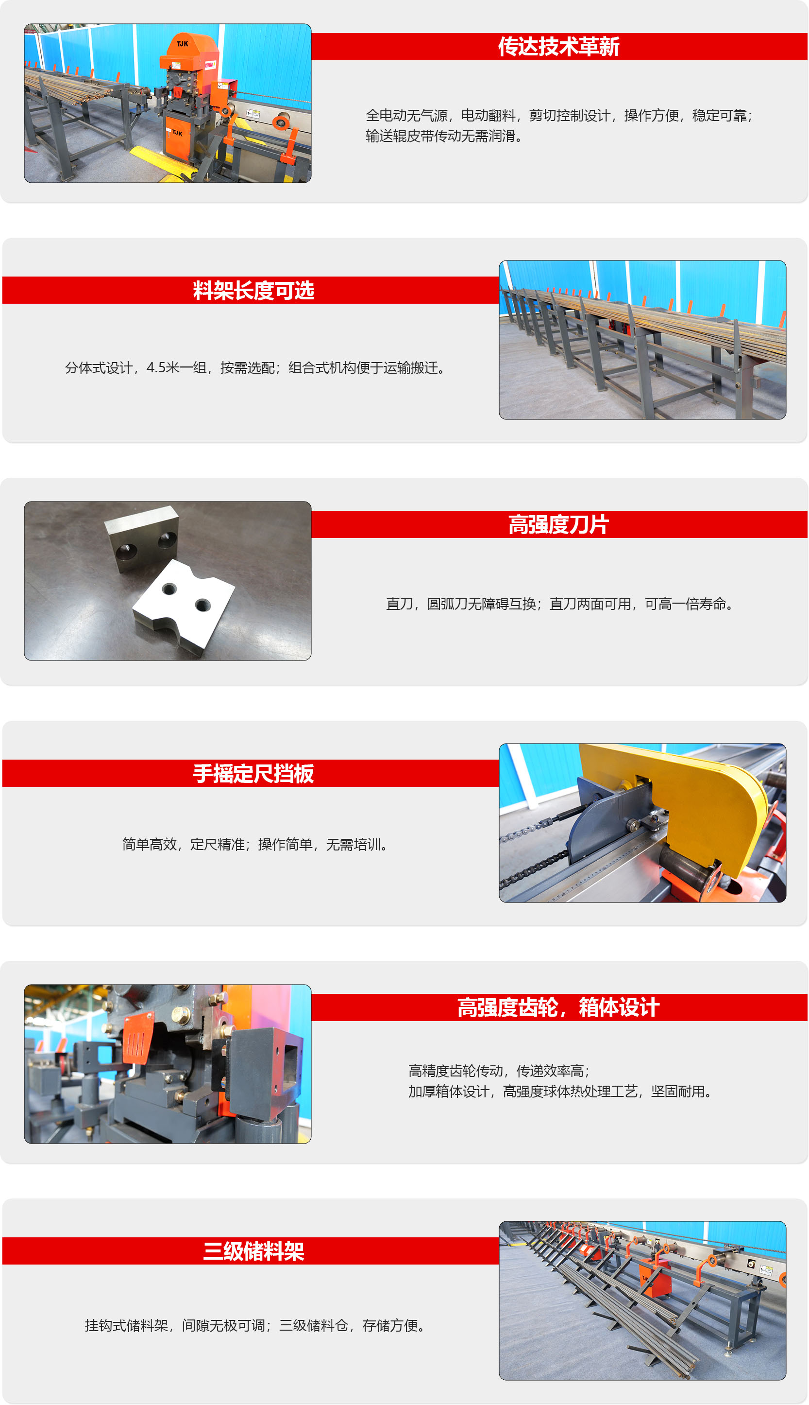 该设备用于将直条钢筋进行高质量的定尺剪切、输送、存储的生产线。包括钢筋原材 上料架,钢筋前后输送,钢筋定尺,钢筋切断,储料仓,电控机构。该设备切断定尺精准、 操作简单、故障率低。是钢筋剪切不可缺少的加工设备。
