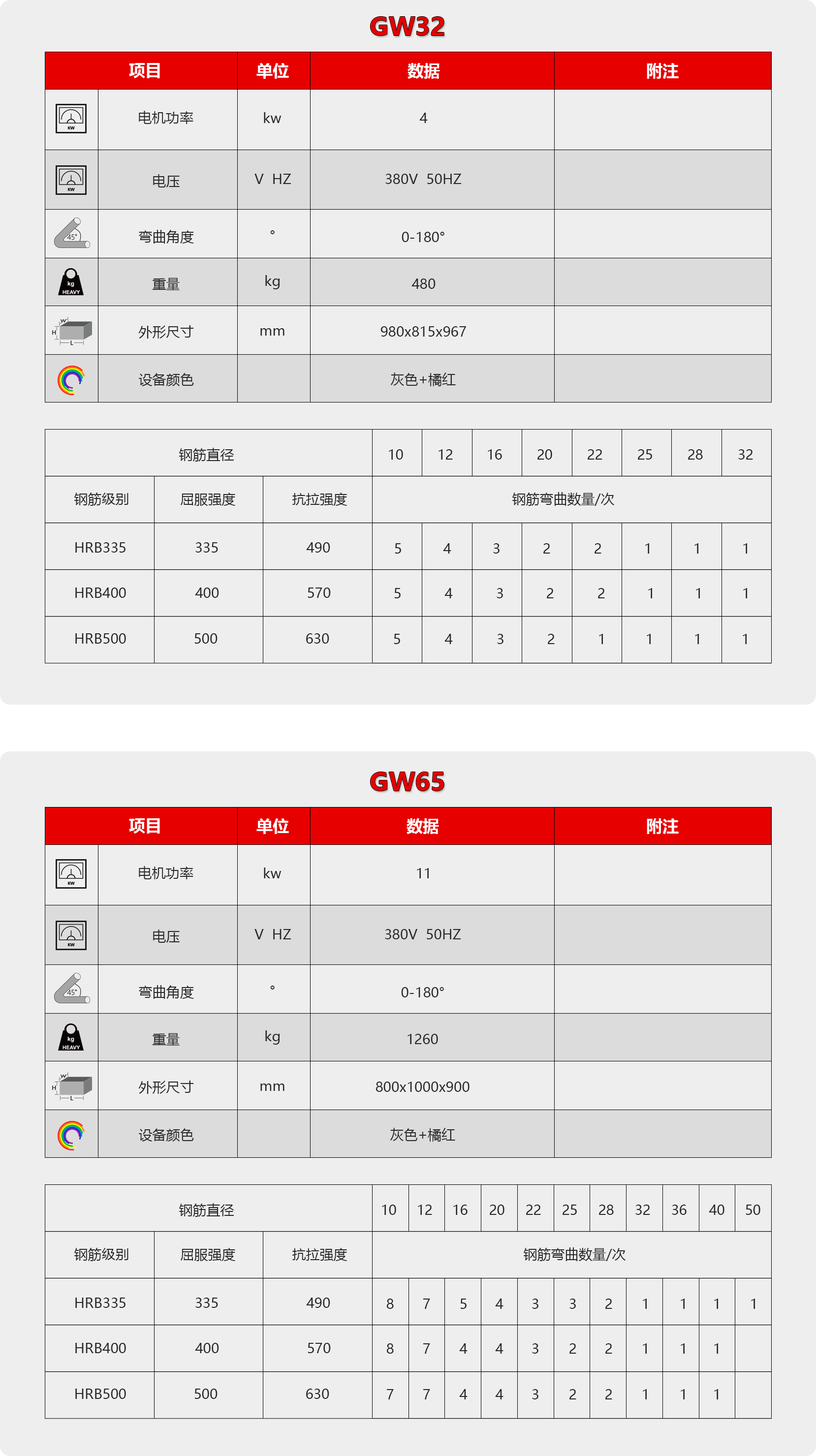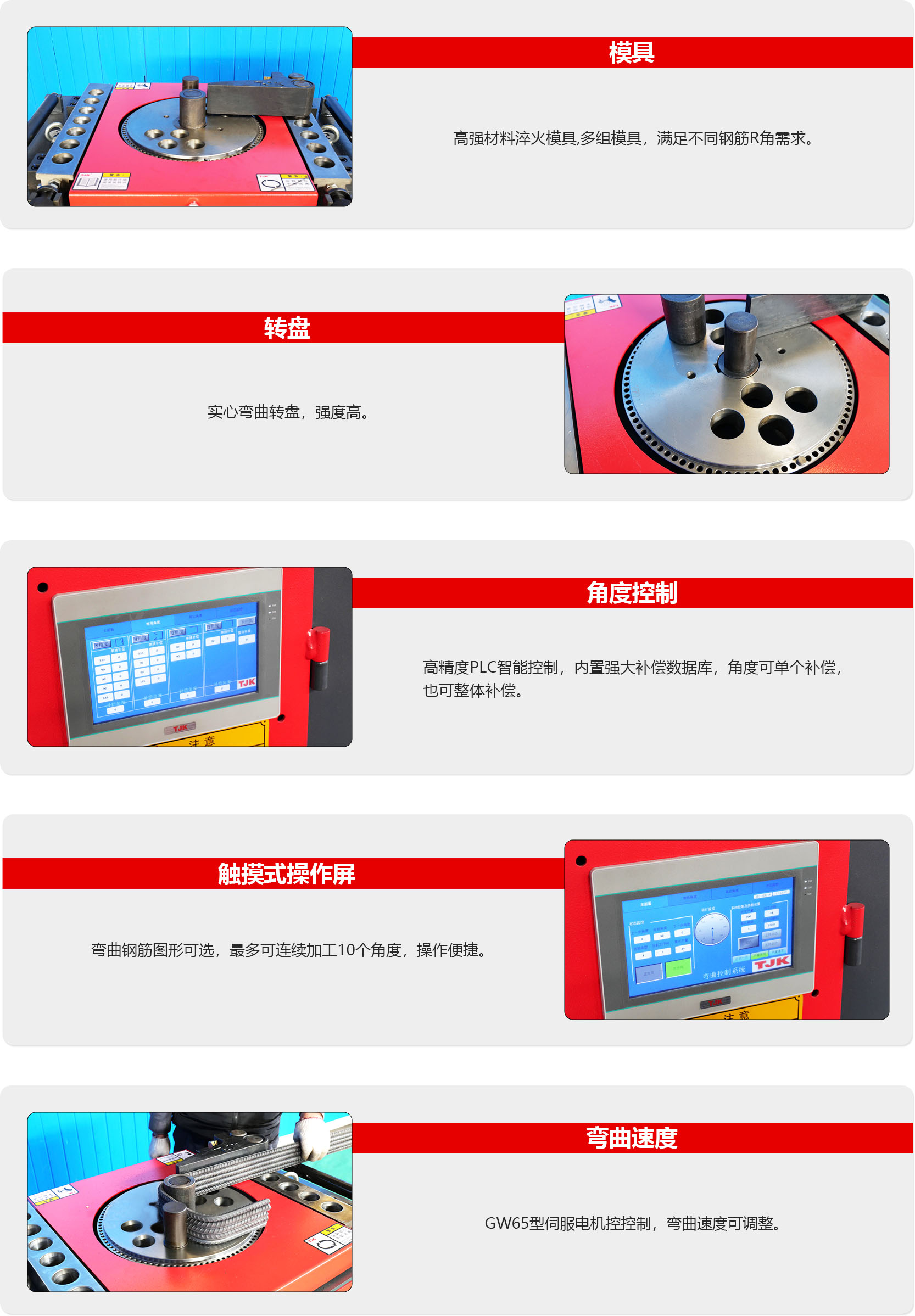 GW32最大加工32mm;GW65最大加工40mm;两款机型外壳采用封闭式设计, 杜绝负重载荷时机器变形;高强度齿轮箱,承载能力高,噪音小;高强度淬火弯曲模具, 使用寿命长。配多套弯曲模具。高精度PLC智能控制,内置强大补偿数据库,角度可单个 补偿,也可整体补偿,触摸屏输入,最多可连续加工10个角度,操作便捷。