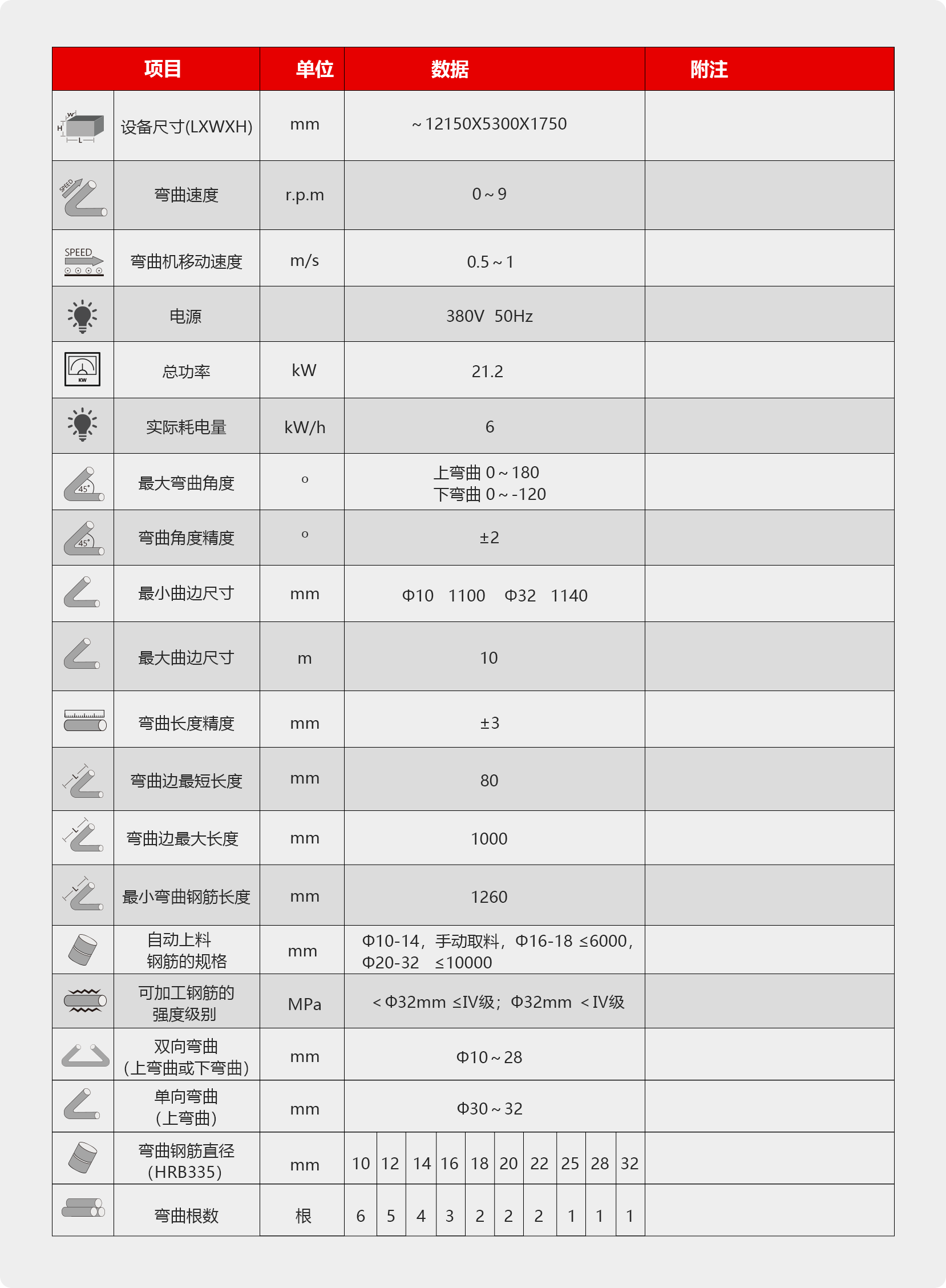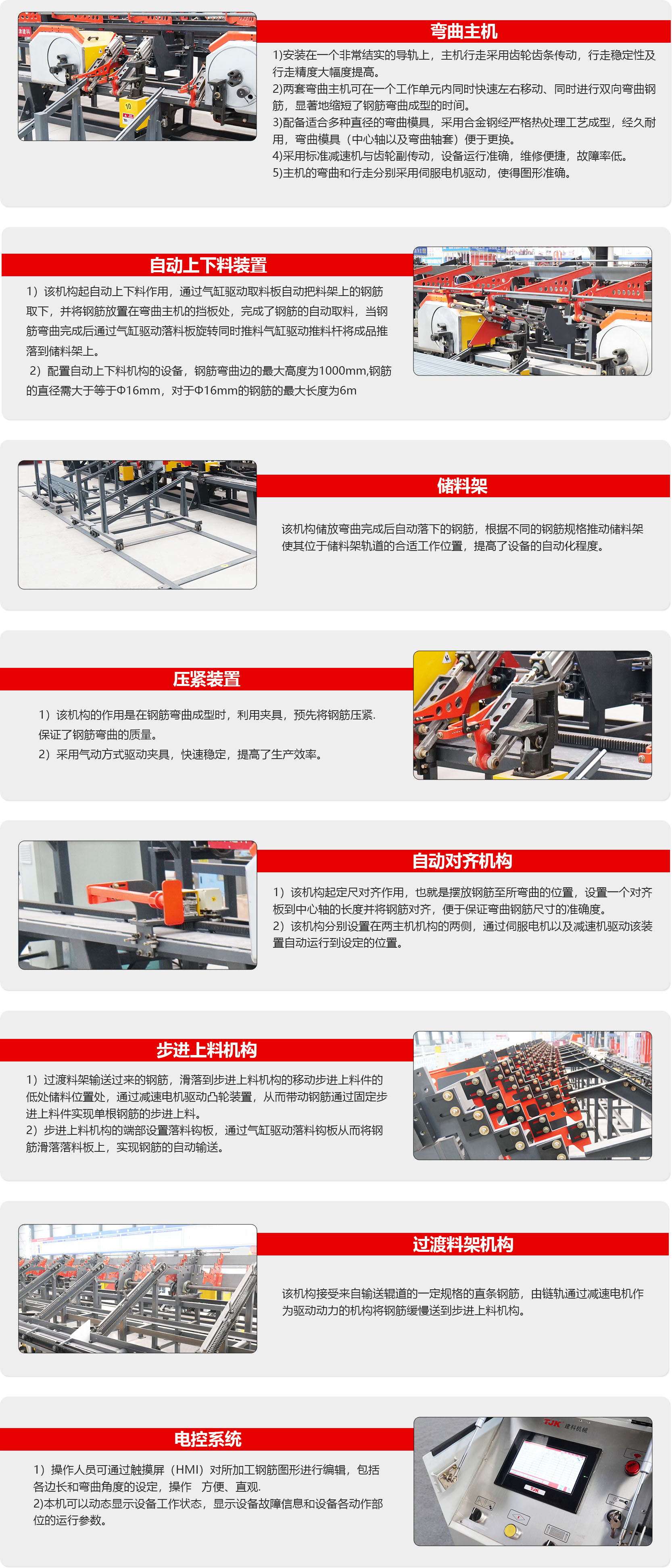 本产品将定尺切断后的钢筋弯曲成正方形、矩形、板筋、U形筋等不同形状的设备。可实现双向同时弯曲钢筋,自动化程度高,操作简便易行。该设备的特点是速度快,实用,可靠,非常受国内、外客户的信赖与青睐,具有强大的信息化拓展能力,图形储存能力,内置常用钢筋图形,触控操作面板调整、设置十分便捷。