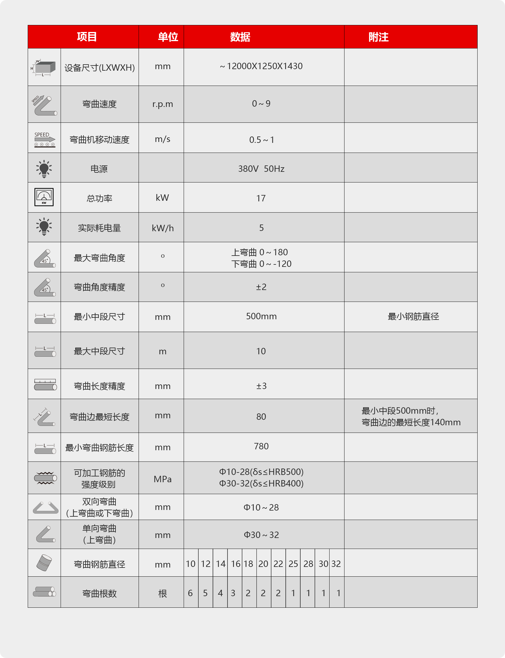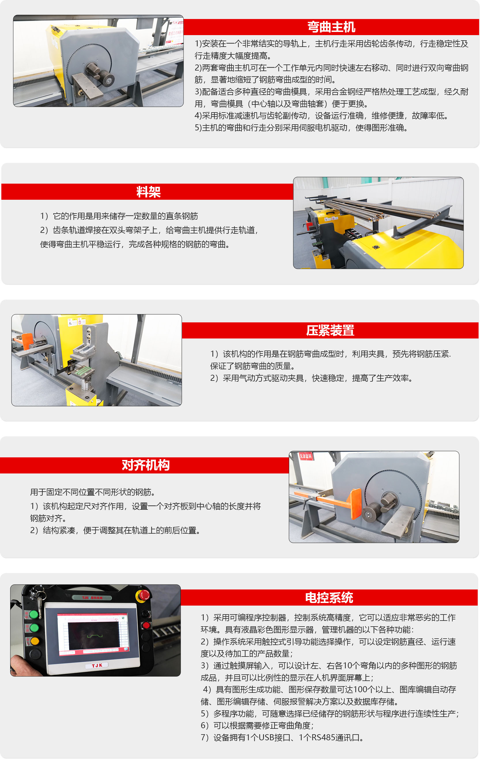本产品将定尺切断后的钢筋弯曲成正方形、矩形、板筋、U形筋等不同形状的设备。可实现双向同时弯曲钢筋,自动化程度高,操作简便易行。该设备的特点是速度快,实用,可靠,非常受国内、外客户的信赖与青睐,具有强大的信息化拓展能力,图形储存能力,内置常用钢筋图形,触控操作面板调整、设置十分便捷。