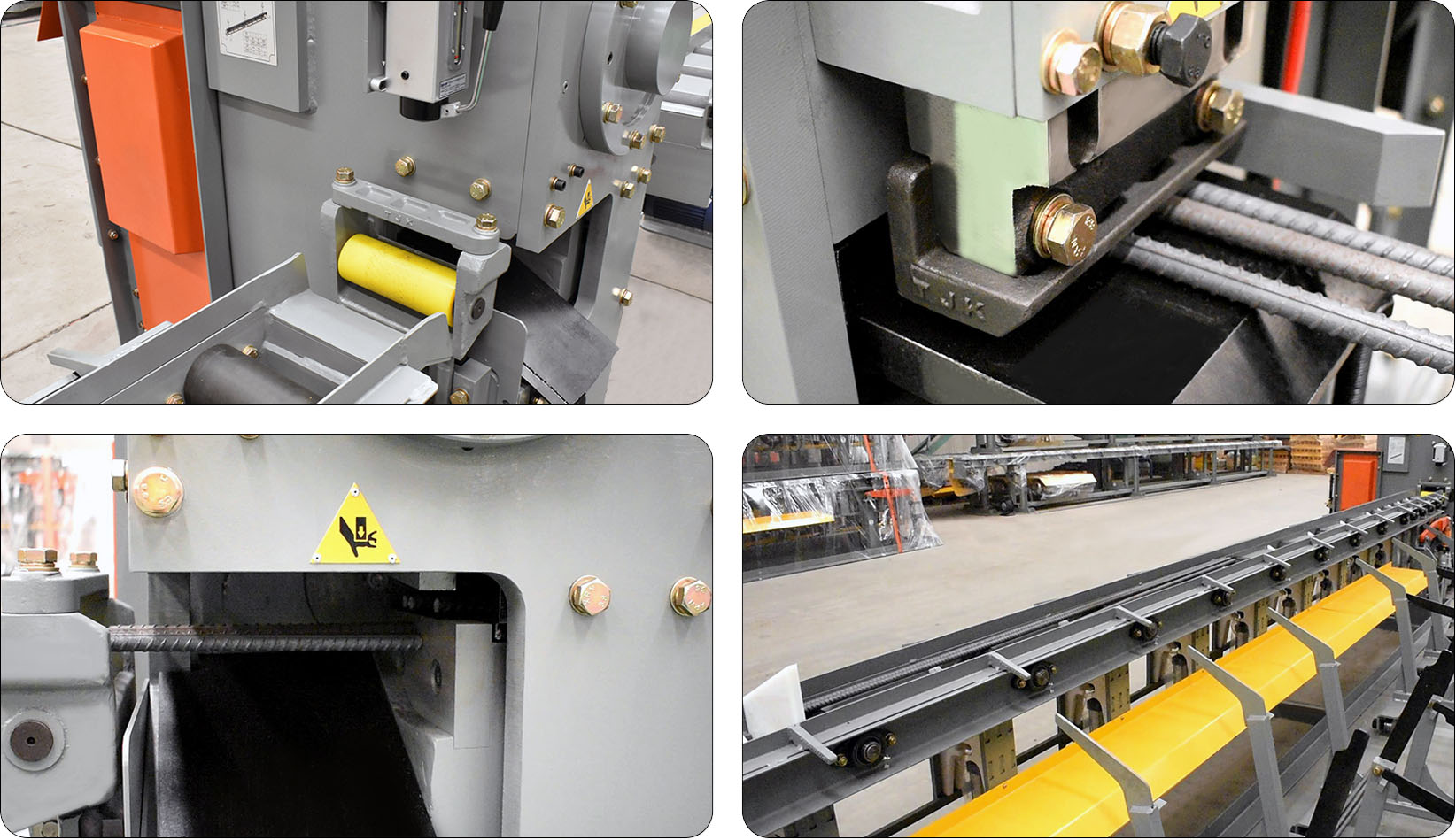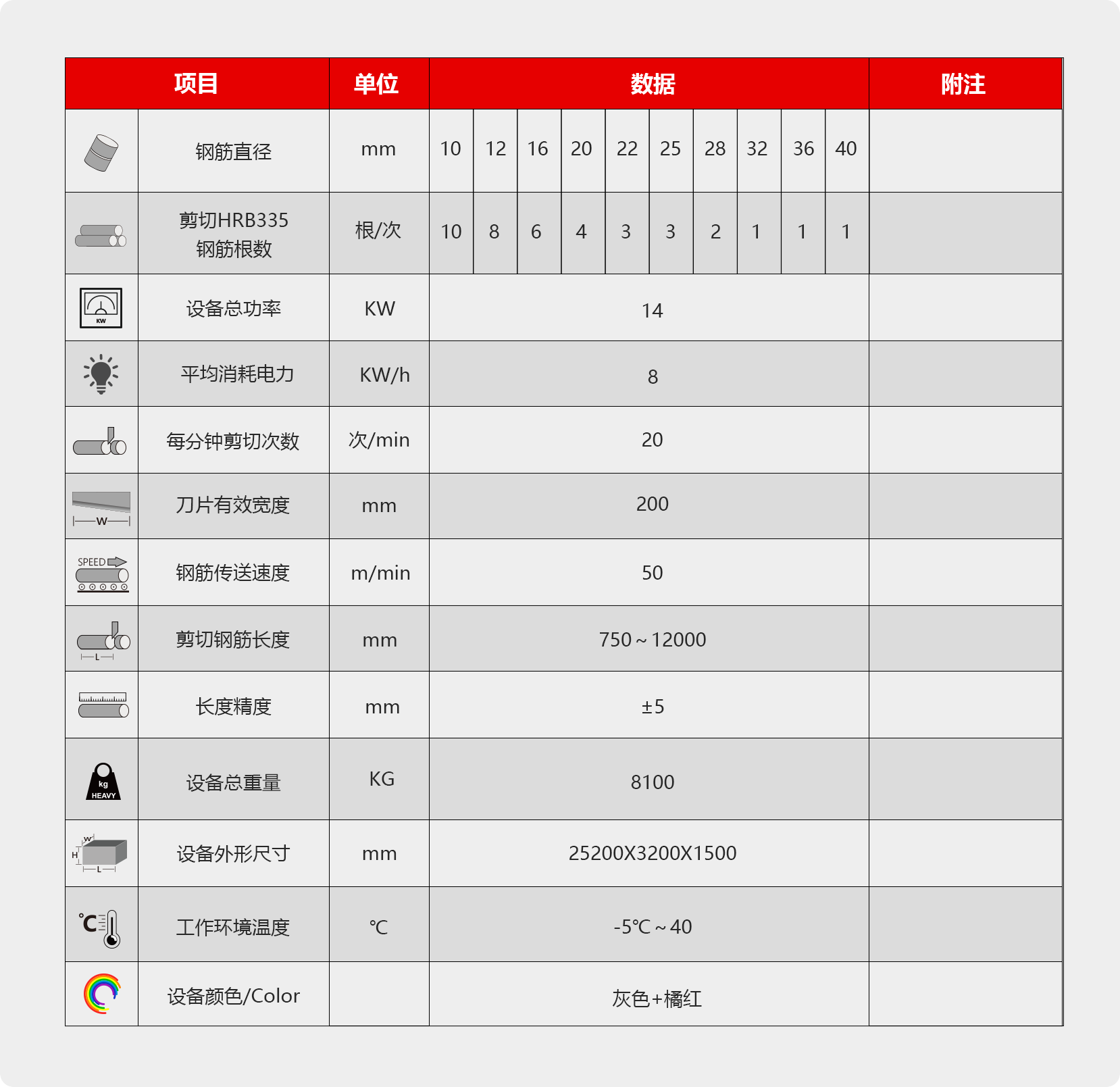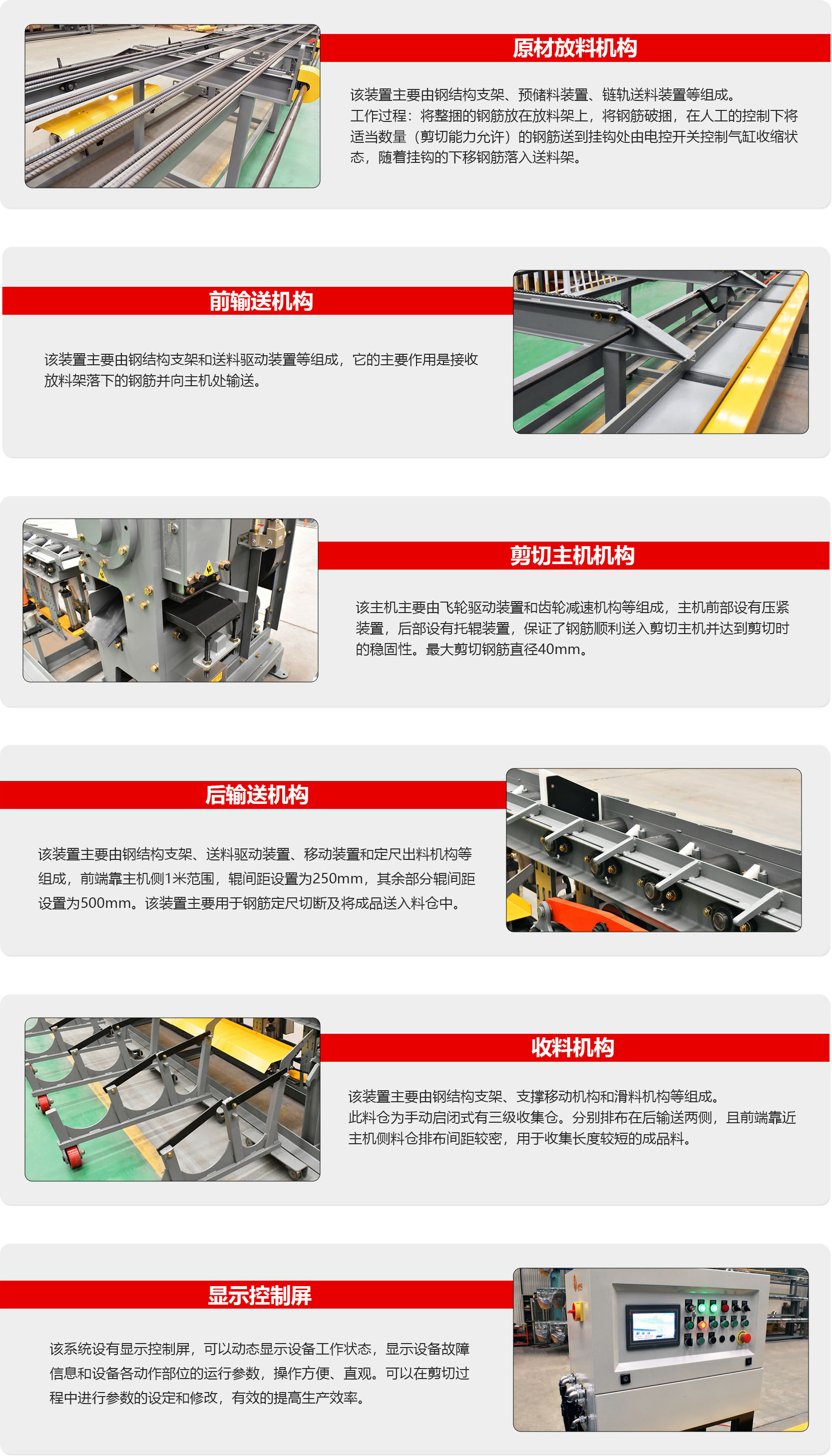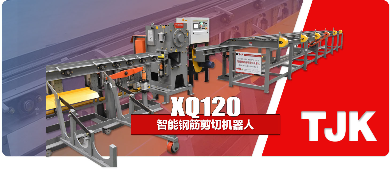XQ120智能钢筋剪切机器人是结合市场实际需求而进行研制、生产的一款高效钢筋 剪切机器人。该设备采用多级齿轮和飞轮结构,可将Φ10-Φ40的钢筋进行快速剪切、输 送、存储的自动加工生产线。该设备结构紧凑,占地面积小,维护简单方便。