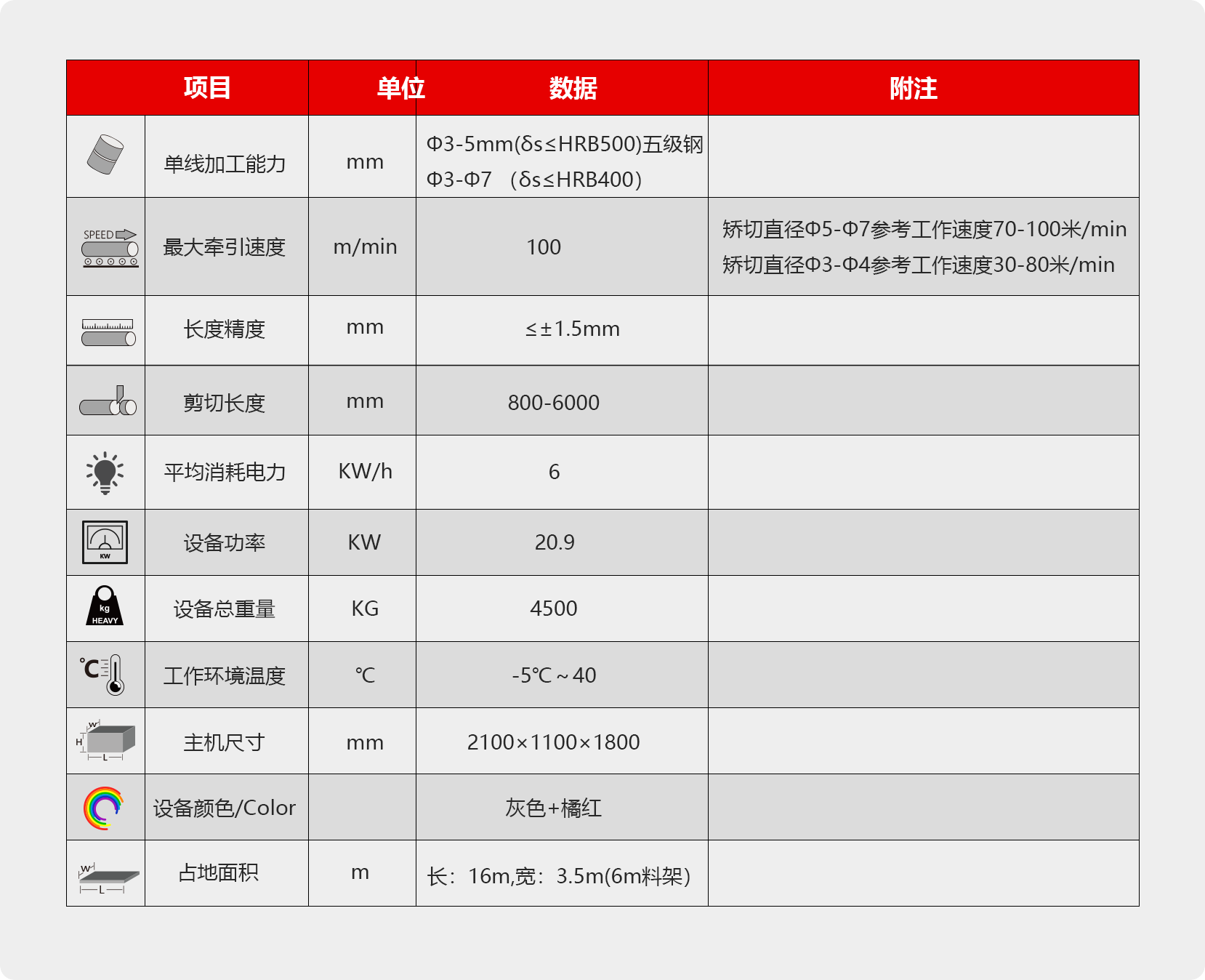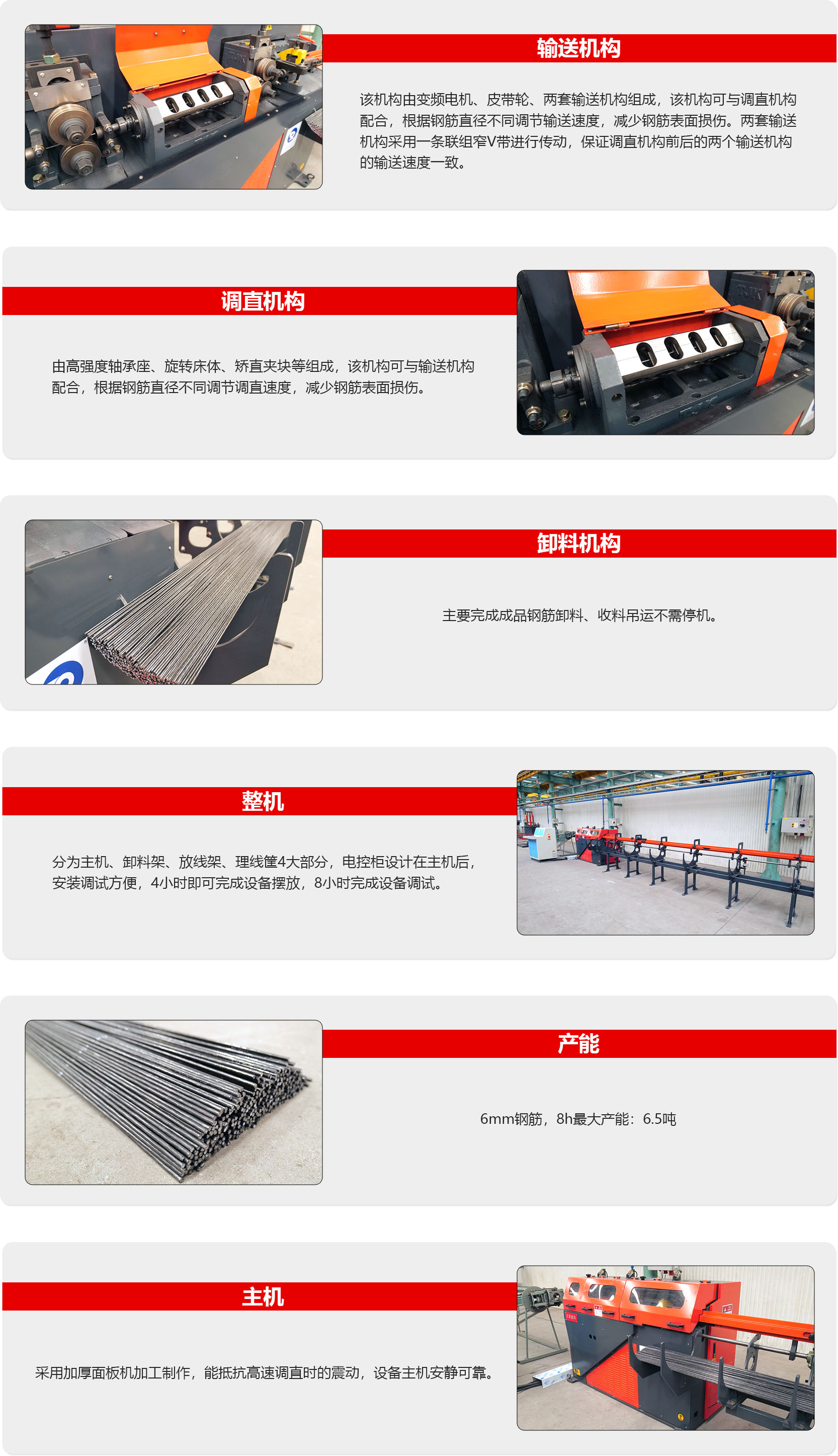 把盘螺或盘圆,通过各种形式的调直机构把钢筋调直,能保持规则的直线段,调直 机构要方便调整钢筋的直度,计长机构方便长度测量,与钢筋接触的牵引轮、调直轮要 耐磨,容易更换,料架要利于打包吊装,常见的调直机构有旋转调直和轮式调直两种方 式,也可以将这两种方式进行结合,GT3-7智能钢筋调直切断机器人是旋转调直机,伺 服剪切,表面损伤小,能自动统计加工根数,打包不停机,生产效率高。