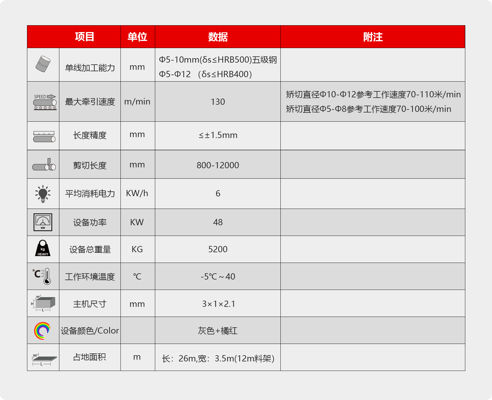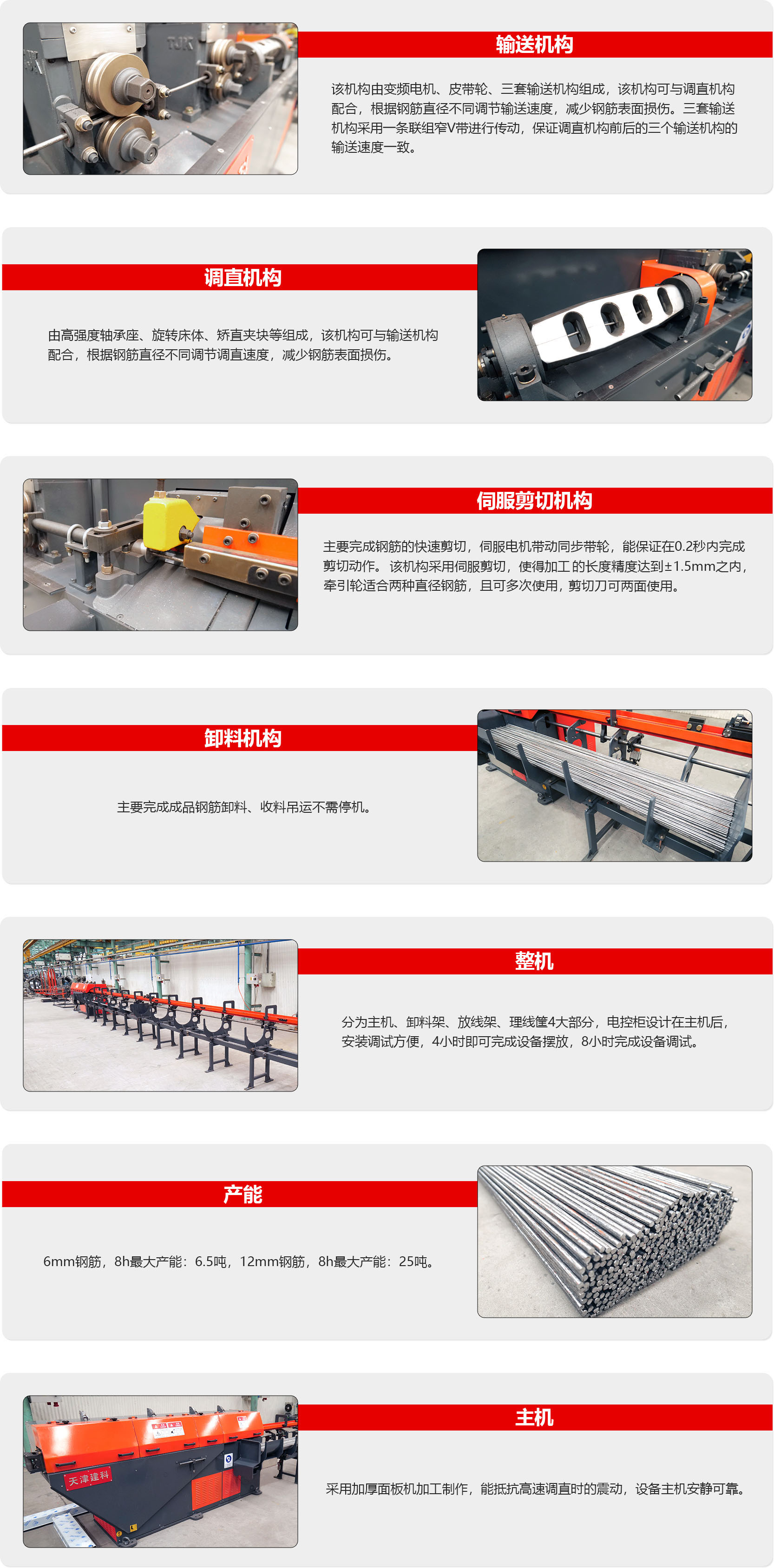 把盘螺或盘圆,通过各种形式的调直机构把钢筋调直,能保持规则的直线段,调直 机构要方便调整钢筋的直度,计长机构方便长度测量,与钢筋接触的牵引轮、调直轮要 耐磨,容易更换,料架要利于打包吊装,常见的调直机构有旋转调直和轮式调直两种方 式,也可以将这两种方式进行结合,GT5-12W智能钢筋调直切断机器人是旋转调直机, 伺服剪切,表面损伤小,能自动统计加工根数,打包不停机,生产效率高。