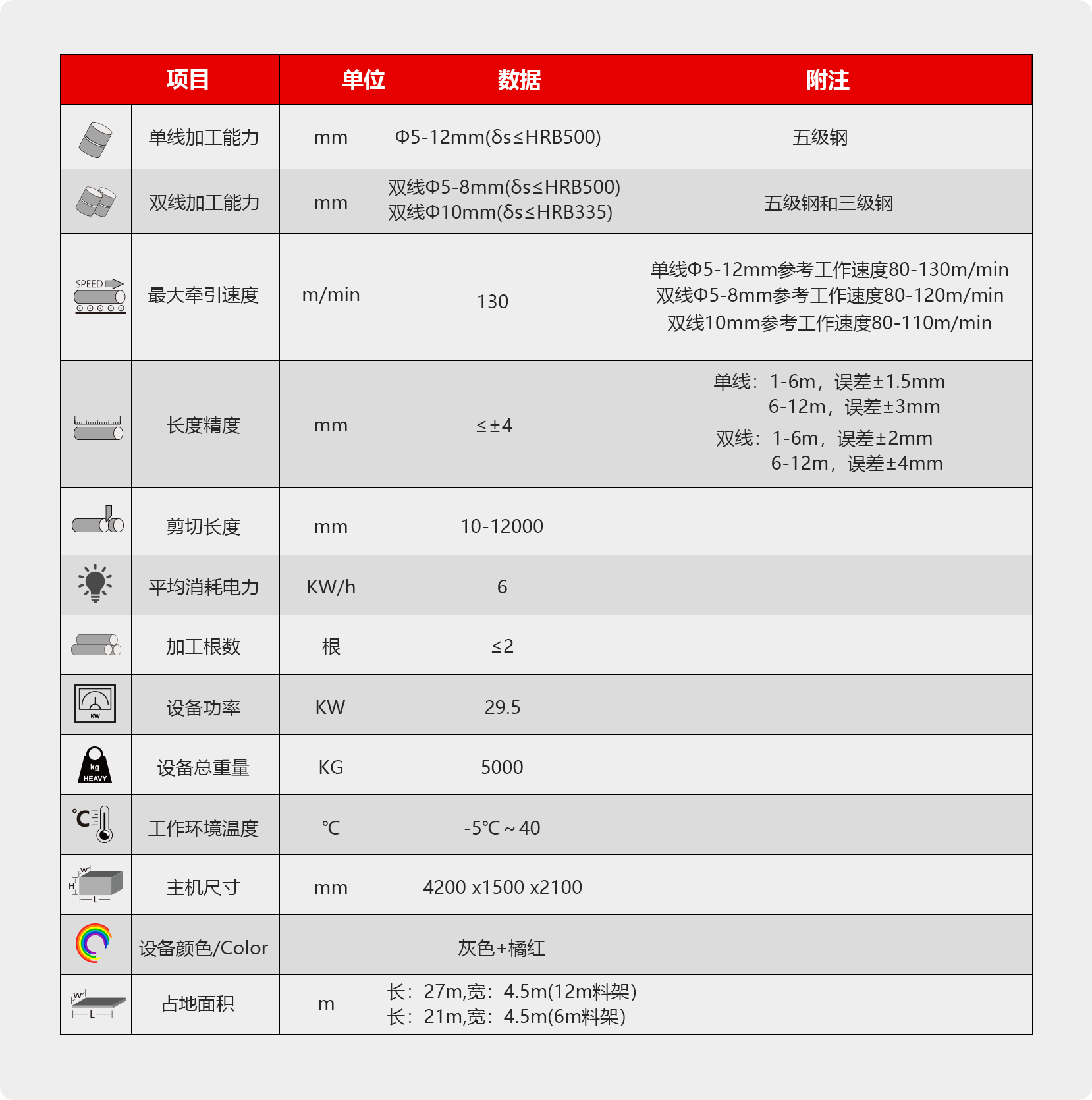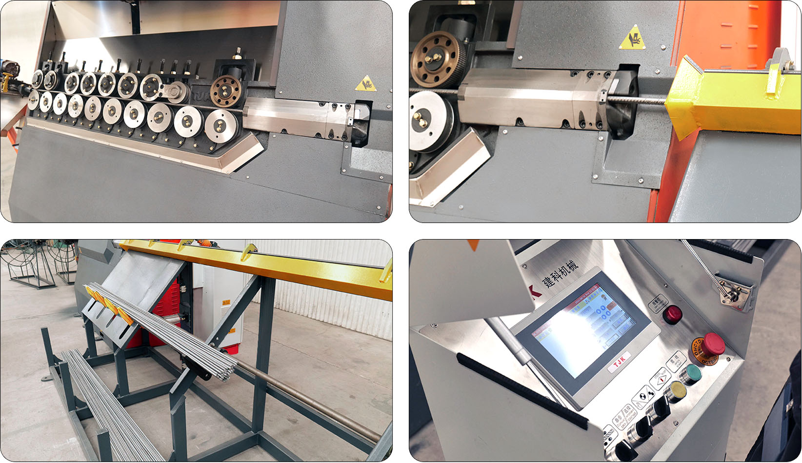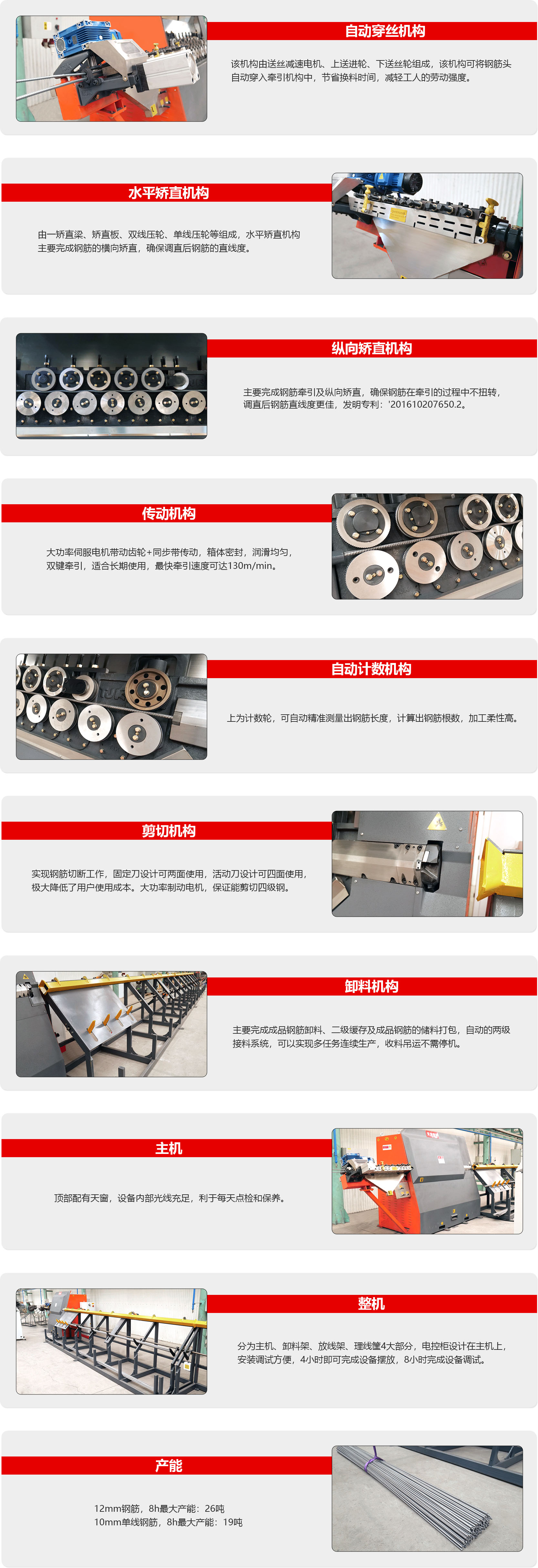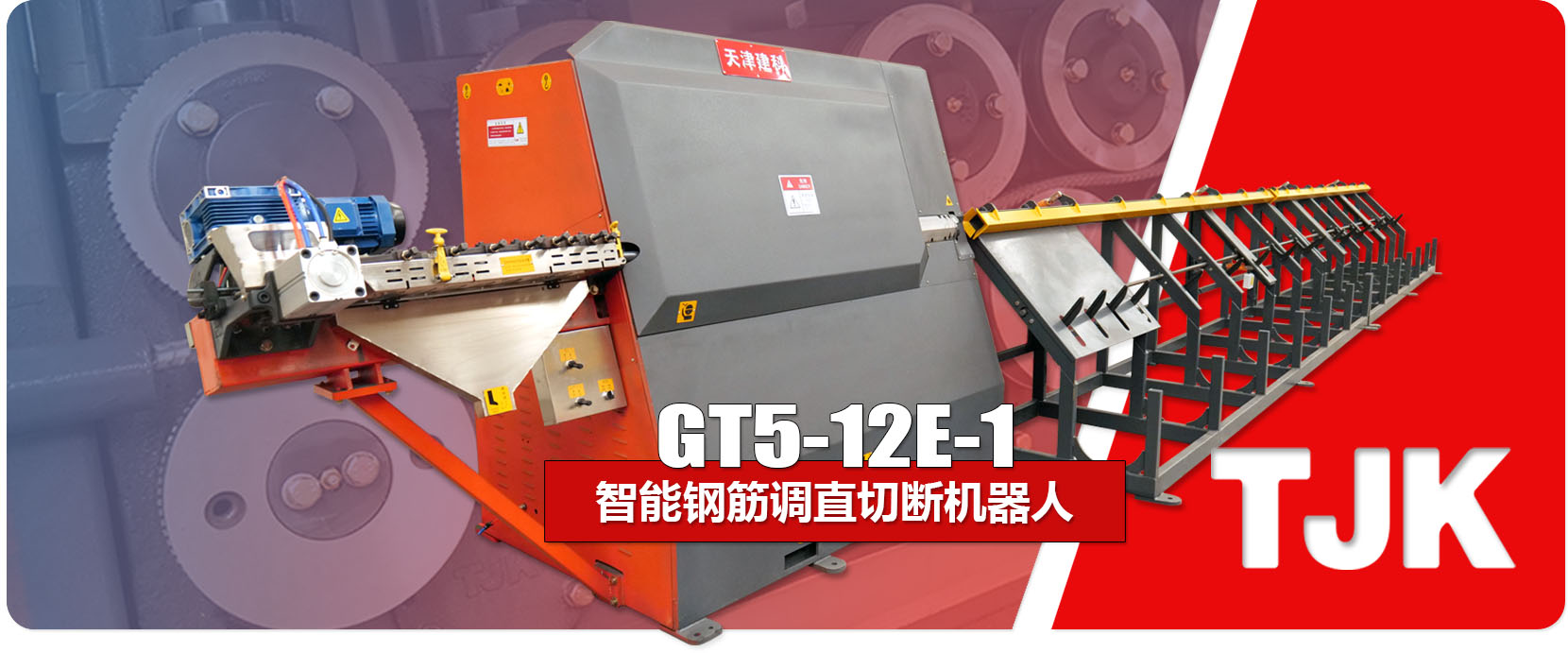 把盘螺或盘圆,通过各种形式的调直机构把钢筋调直,能保持规则的直线段,调直 机构要方便调整钢筋的直度,计长机构方便长度测量,与钢筋接触的牵引轮、调直轮要 耐磨,容易更换,料架要利于打包吊装,常见的调直机构有旋转调直和轮式调直两种方 式,也可以将这两种方式进行结合,GT5-12E-1智能钢筋调直切断机器人是具有水平和 纵向调直机构的轮式调直机,可两个方向调直、自动计长剪切,表面损伤小,能自动统 计加工根数,缓冲接料使吊装打包不停机。能多任务快速调直剪切钢筋,生产效率高。