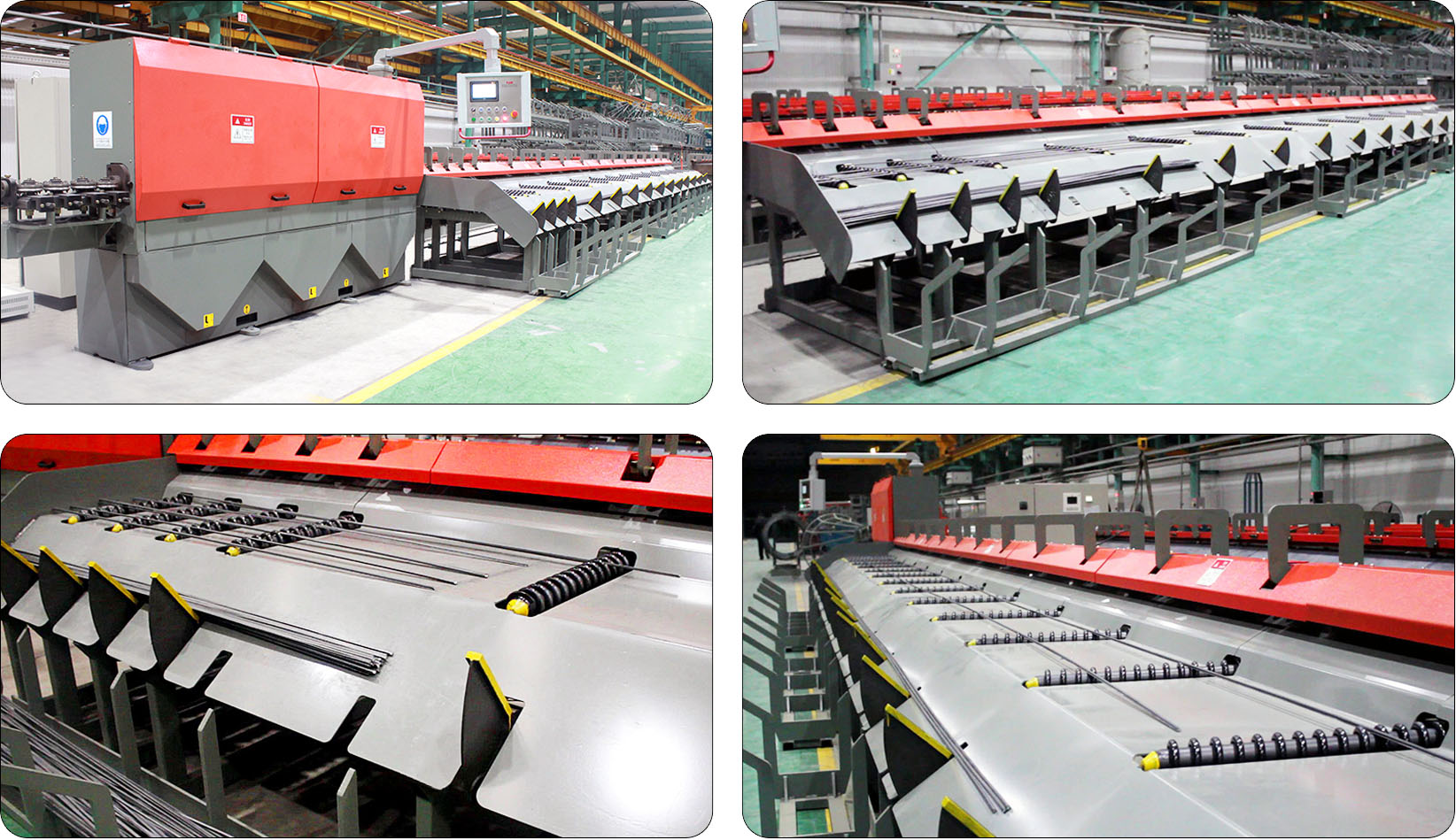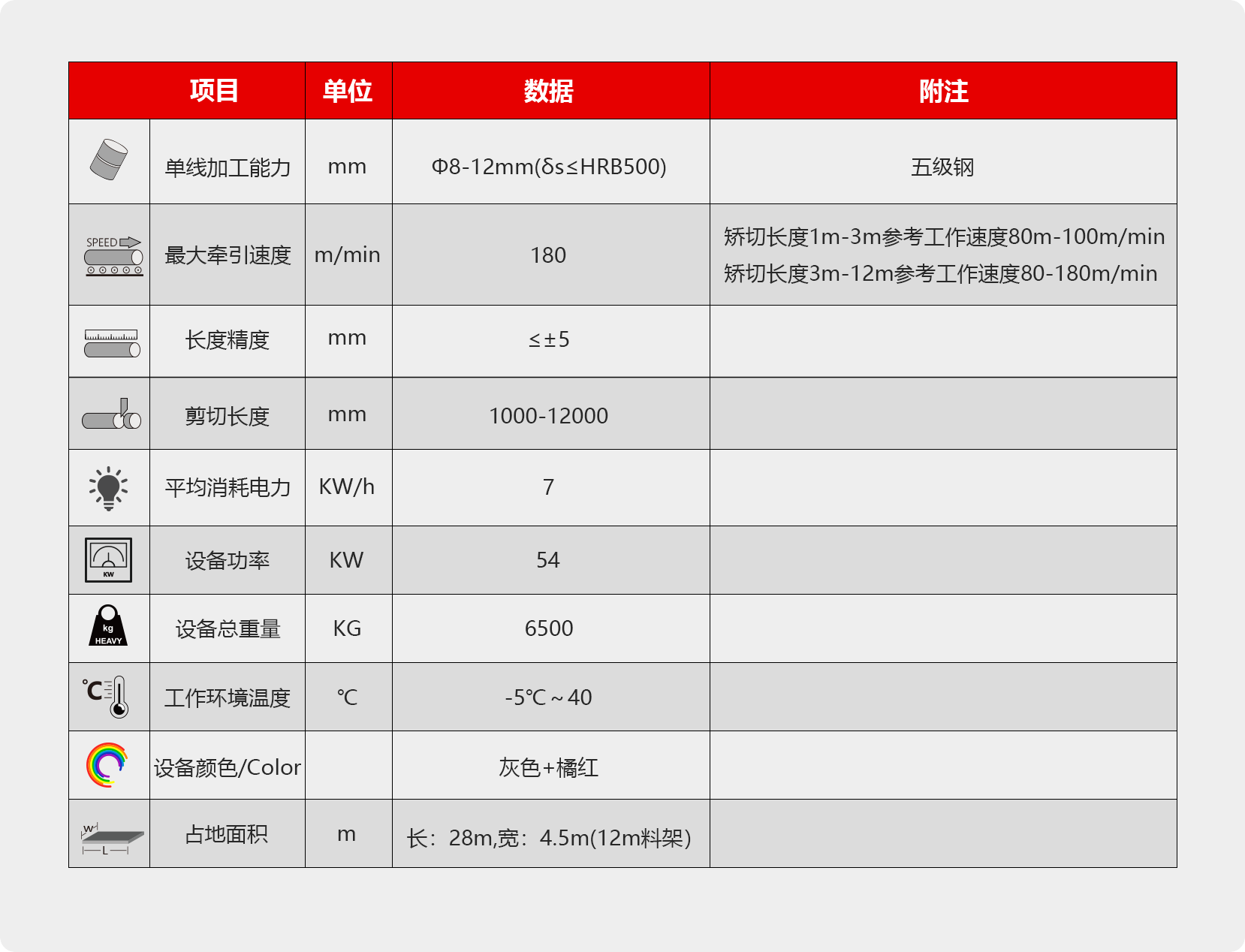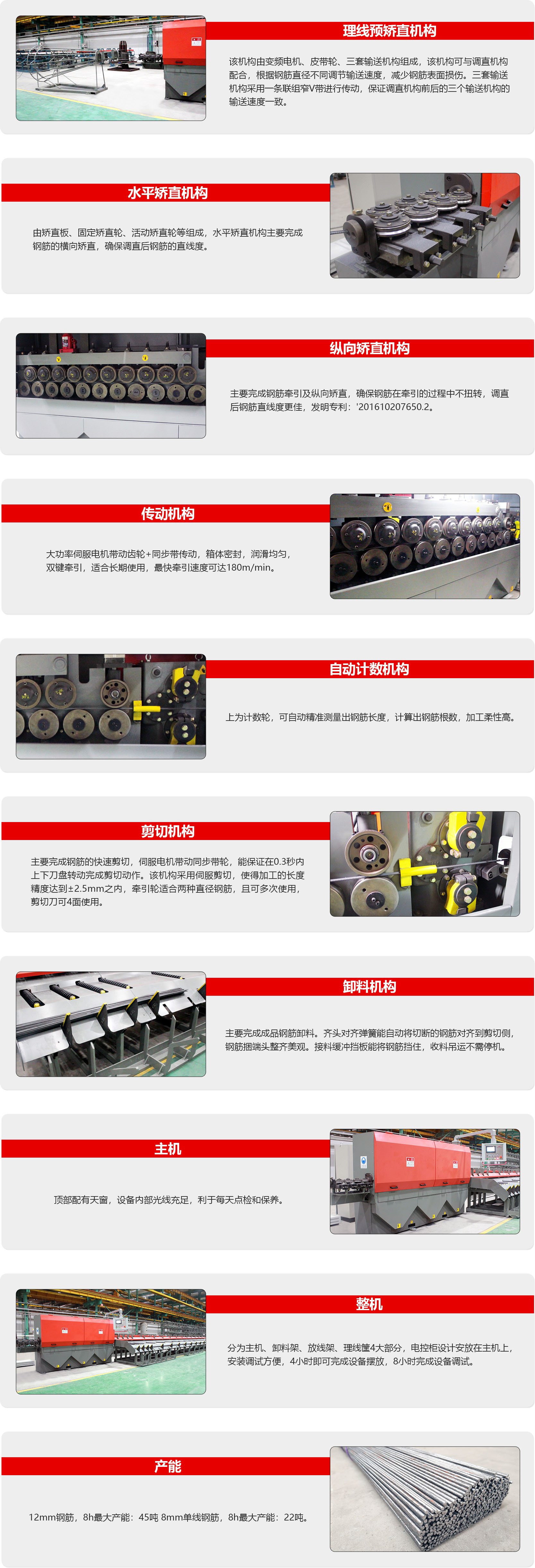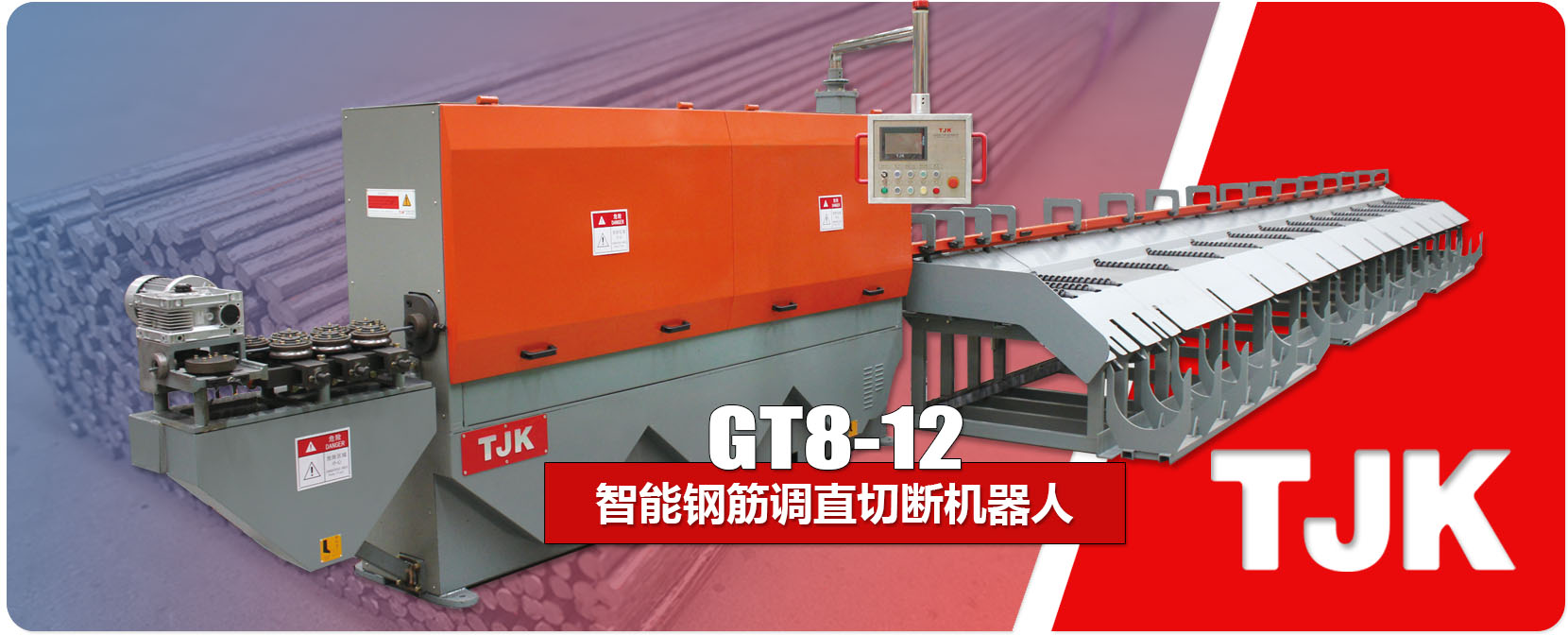 把盘螺或盘圆,通过各种形式的调直机构把钢筋调直,能保持规则的直线段,调直 机构要方便调整钢筋的直度,计长机构方便长度测量,与钢筋接触的牵引轮、调直轮要 耐磨,容易更换,料架要利于打包吊装,常见的调直机构有旋转调直和轮式调直两种方 式,也可以将这两种方式进行结合,GT8-12智能钢筋调直切断机器人是具有水平和纵向 调直机构的轮式调直机,可两个方向调直、自动计长剪切,表面损伤小,能自动统计加 工根数,缓冲接料使吊装打包不停机。能多任务快速调直剪切钢筋,生产效率高。