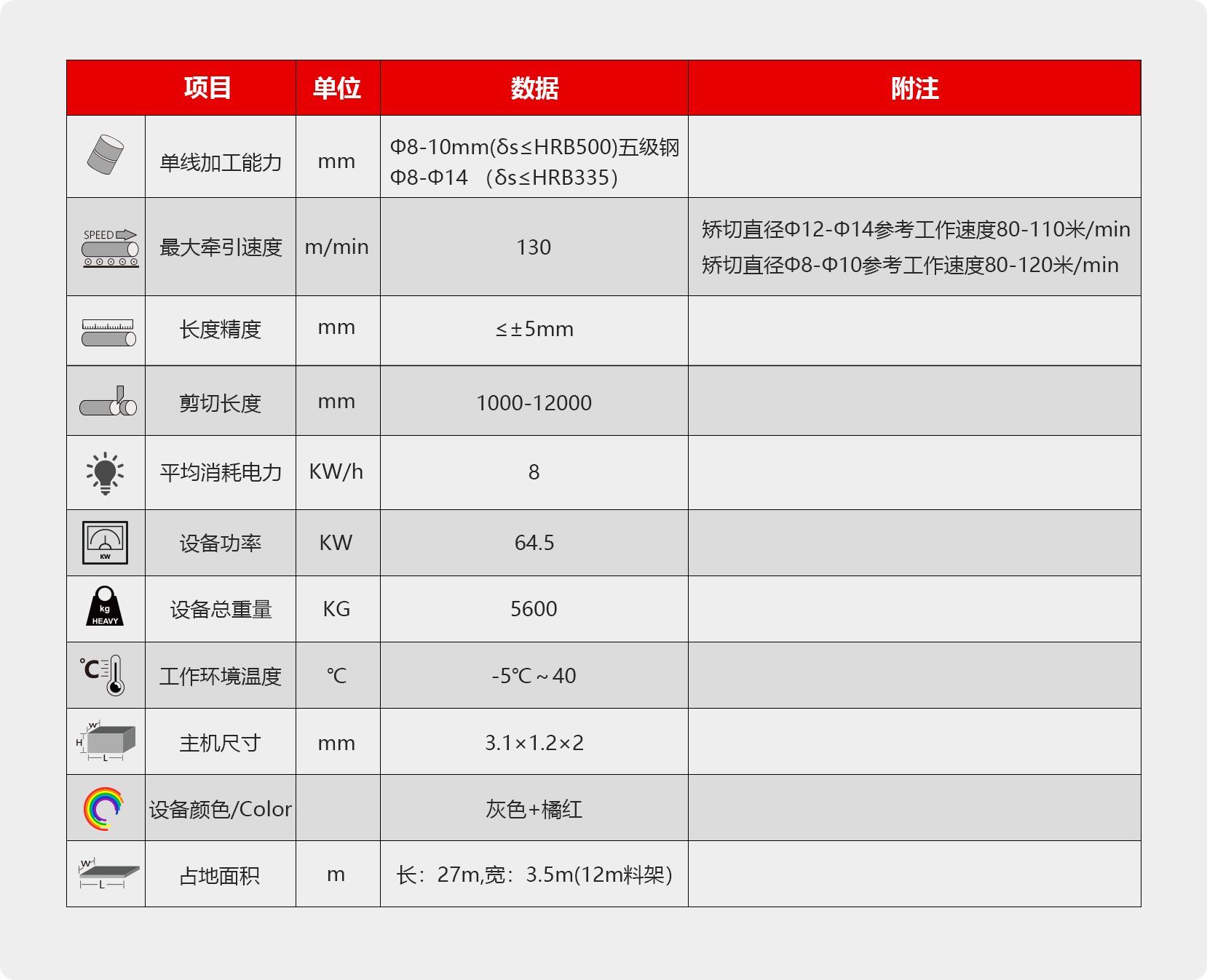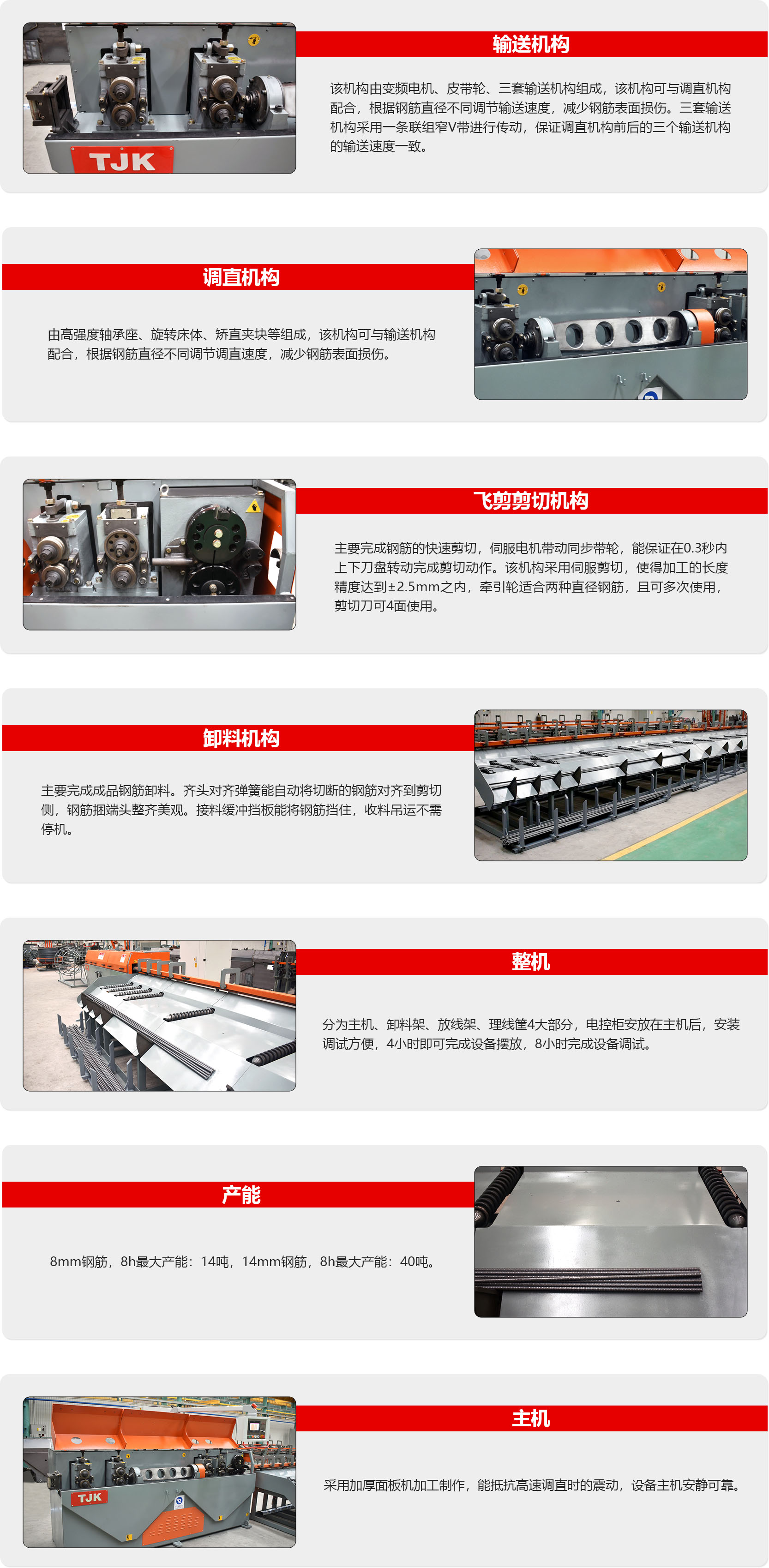 把盘螺或盘圆,通过各种形式的调直机构把钢筋调直,能保持规则的直线段,调直 机构要方便调整钢筋的直度,计长机构方便长度测量,与钢筋接触的牵引轮、调直轮要 耐磨,容易更换,料架要利于打包吊装,常见的调直机构有旋转调直和轮式调直两种方 式,也可以将这两种方式进行结合,GT8-14C智能钢筋调直切断机器人是旋转调直机, 伺服剪切,表面损伤小,能自动统计加工根数,打包不停机,生产效率高。