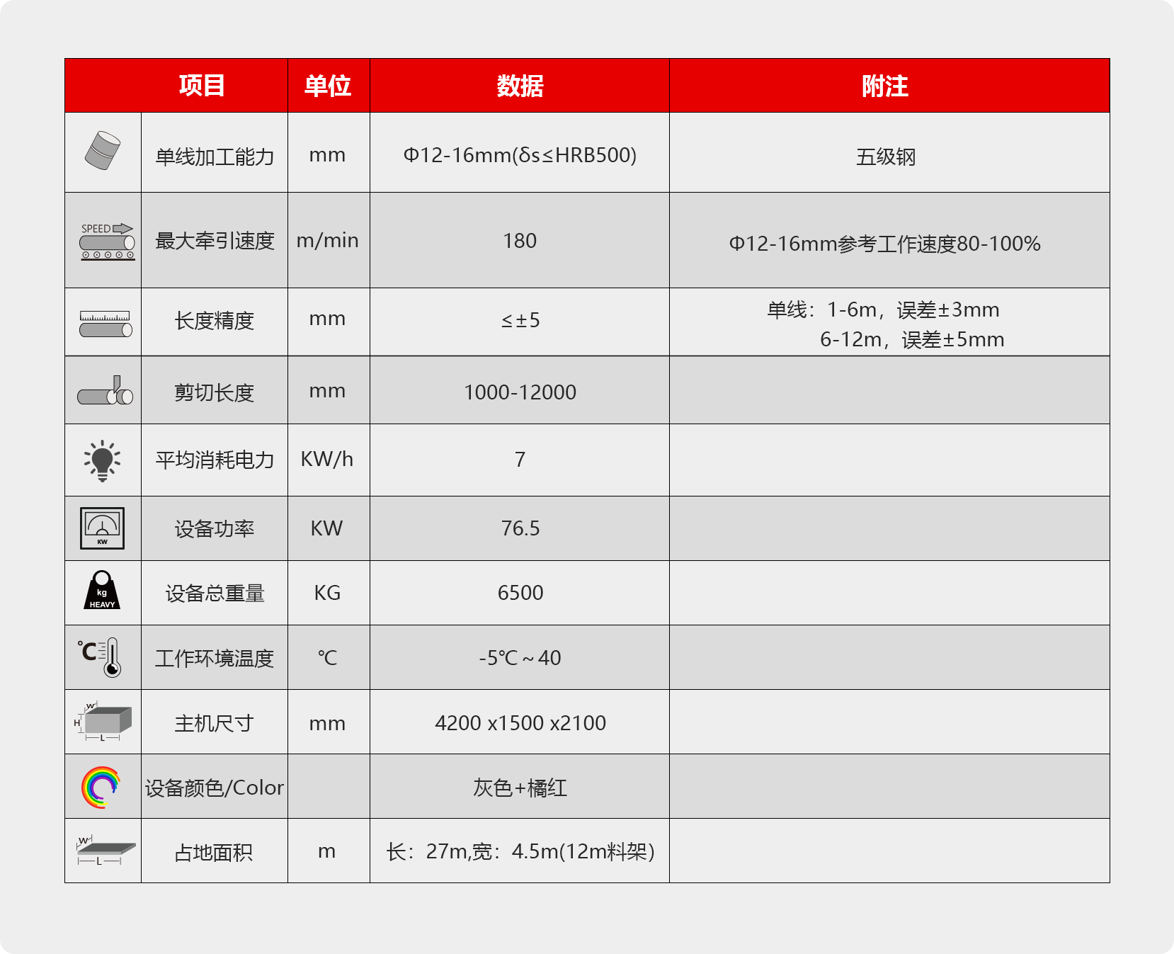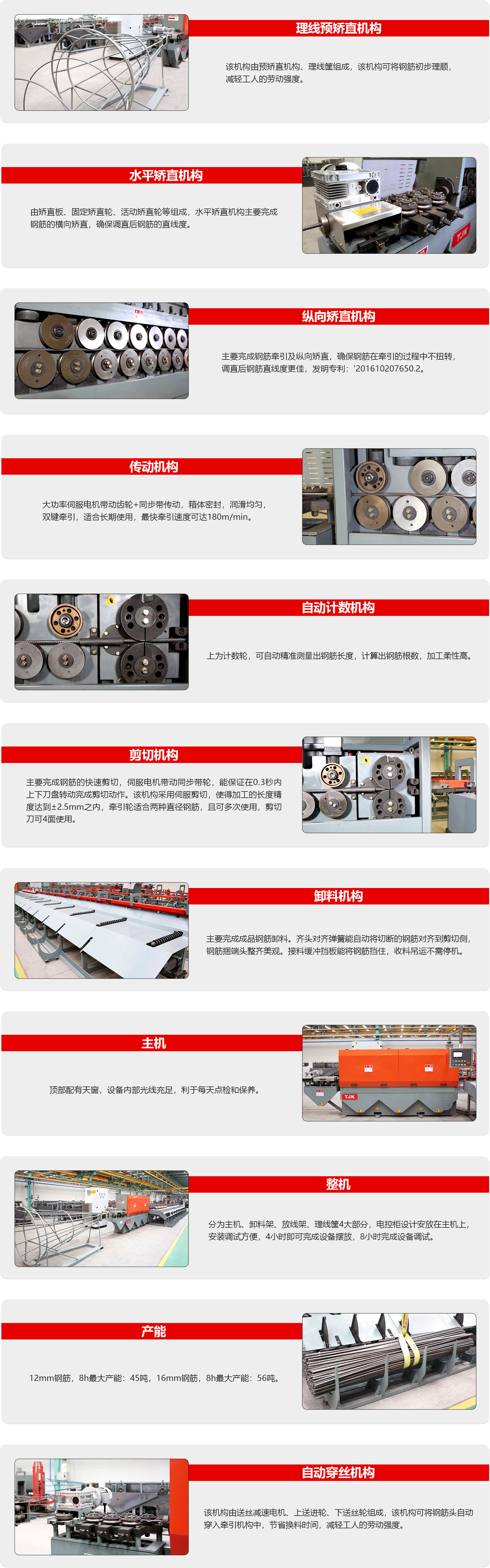 把盘螺或盘圆,通过各种形式的调直机构把钢筋调直,能保持规则的直线段,调直 机构要方便调整钢筋的直度,计长机构方便长度测量,与钢筋接触的牵引轮、调直轮要 耐磨,容易更换,料架要利于打包吊装,常见的调直机构有旋转调直和轮式调直两种方 式,也可以将这两种方式进行结合,GT12-16智能钢筋调直切断机器人是具有水平和纵 向调直机构的轮式调直机,可两个方向调直、自动计长剪切,表面损伤小,能自动统计 加工根数,缓冲接料使吊装打包不停机。能多任务快速调直剪切钢筋,生产效率高。
