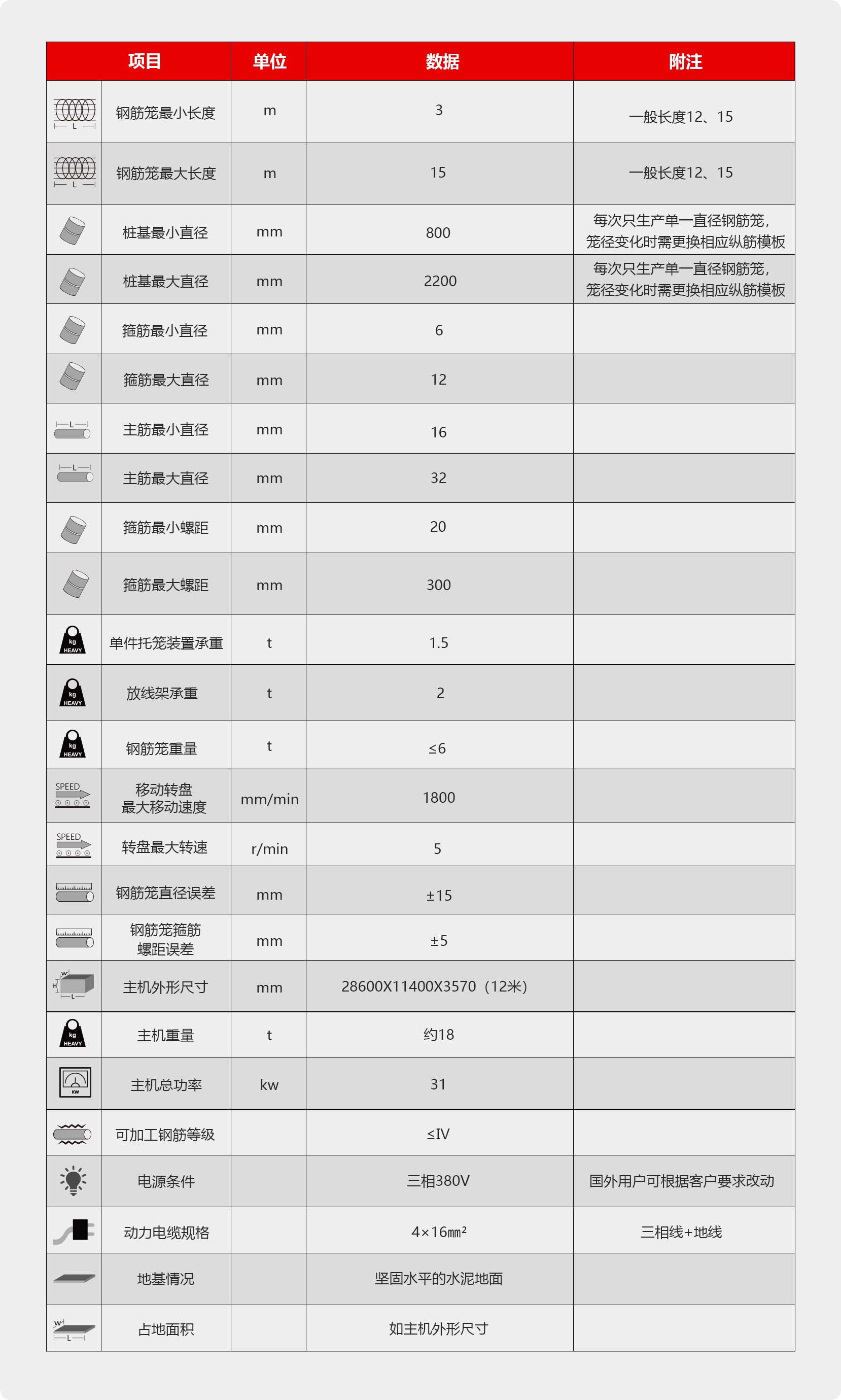该设备可根据客户的需要配备相应的模圈或者圆盘,将盘条或者直条箍筋螺旋缠绕并焊接在主筋外侧,实现不同规格的钢筋笼的自动化生产,产量大、精度高、变换规格方便、操作故障率低、节能性强、消耗低、质量高。