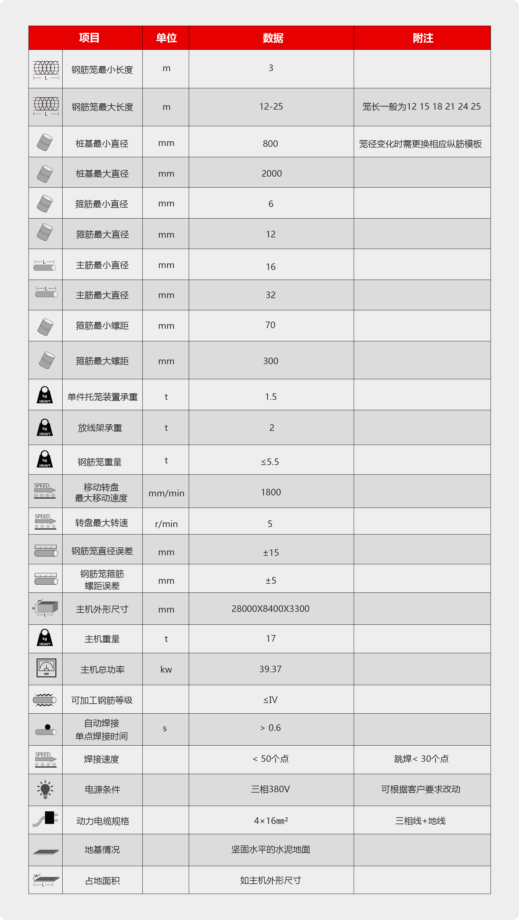 该设备可根据客户的需要配备相应的模圈或者圆盘,将盘条或者直条箍筋螺旋缠绕并焊接在主筋外侧,实现不同规格的钢筋笼的自动化生产,产量大、精度高、变换规格方便、操作故障率低、节能性强、消耗低、质量高。