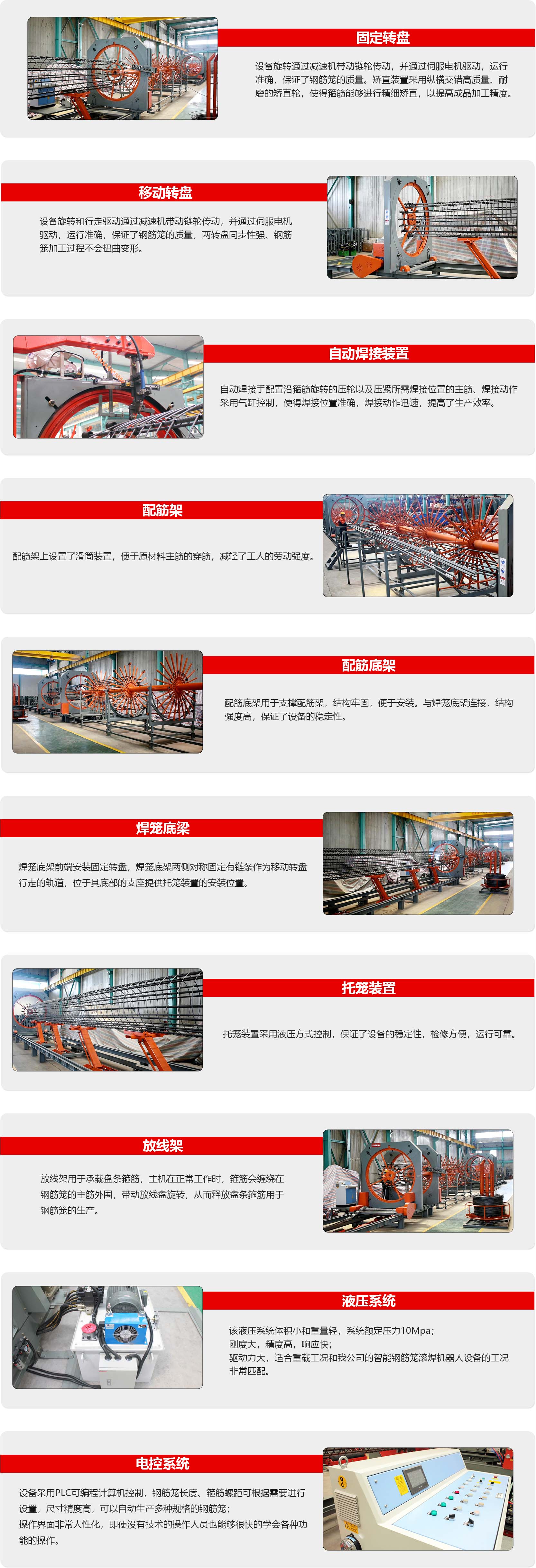 该设备可根据客户的需要配备相应的模圈或者圆盘,将盘条或者直条箍筋螺旋缠绕并焊接在主筋外侧,实现不同规格的钢筋笼的自动化生产,产量大、精度高、变换规格方便、操作故障率低、节能性强、消耗低、质量高。