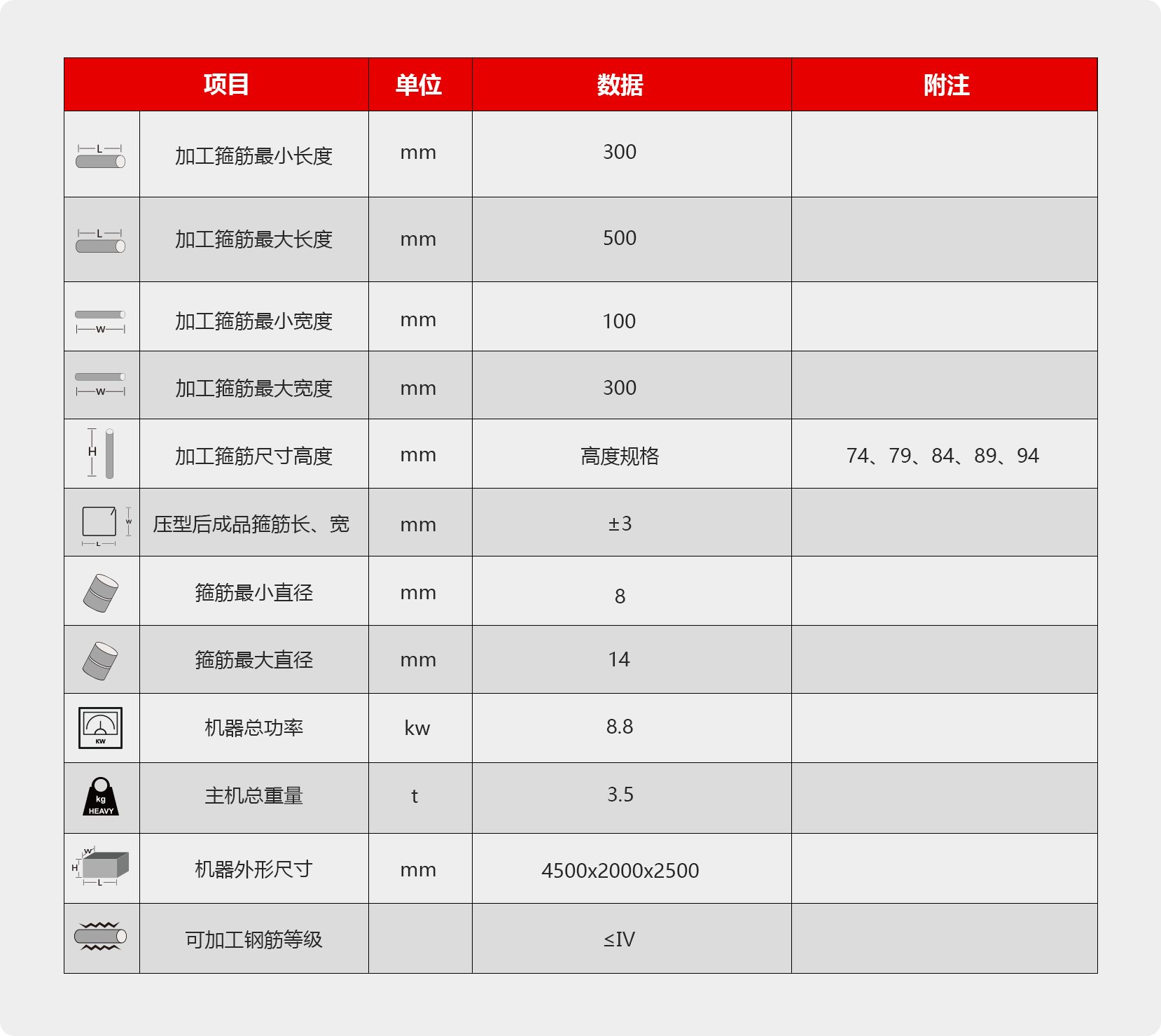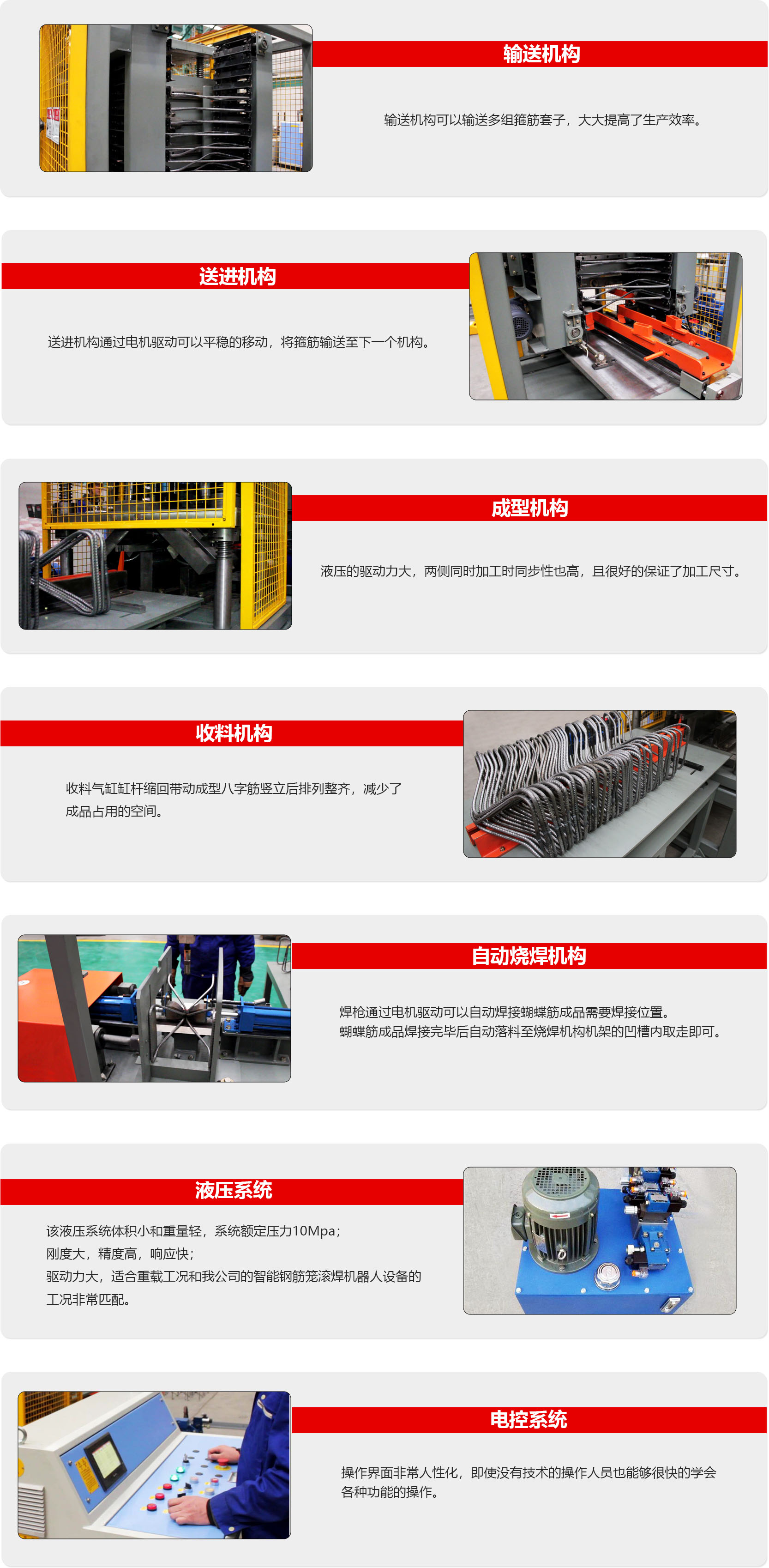 该设备可根据客户的需要对不同规格的平面八字筋自动完成压型及立体焊接一体成型,实现不同规格的蝴蝶筋的自动化生产,产量大、精度高、变换规格方便、操作故障率低、节能性强、消耗低、质量高。
