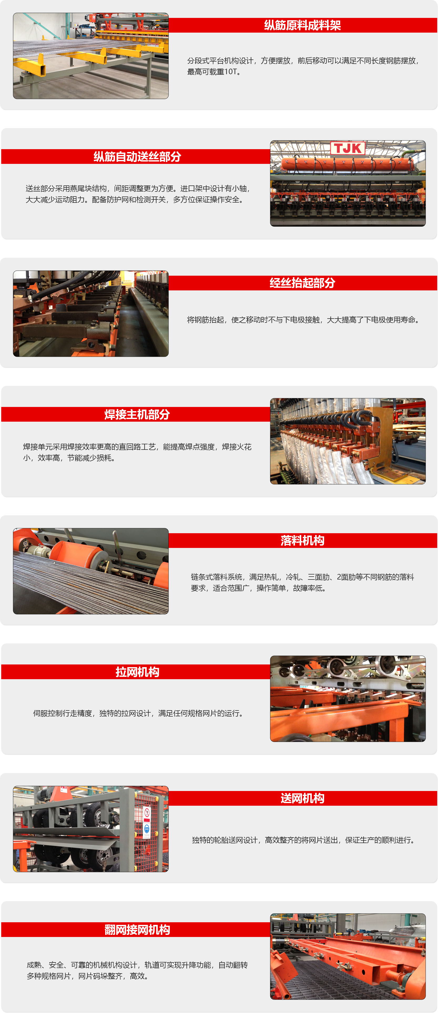 该设备横筋、纵筋均采用定尺切断直条上料,焊接速度快,设备运行稳定。生产线 技术涵盖了多项发明专利(包括发明专利号分别为:200910228619.7、20111014343 7.7、201310316984.X、201310335940.1等多项专利),主要使用领域主要包括国内 外专业化的围栏,建筑、矿山等。