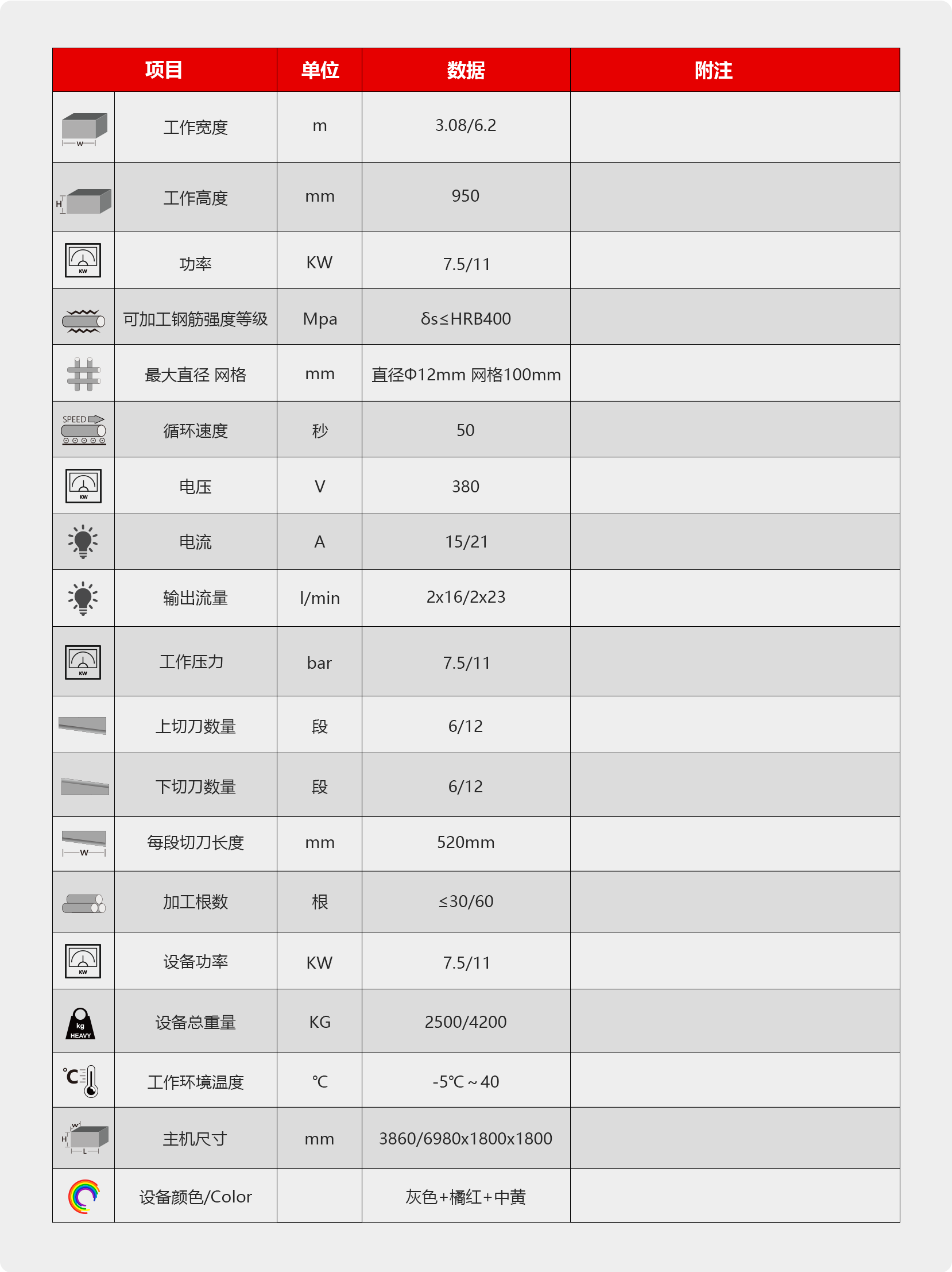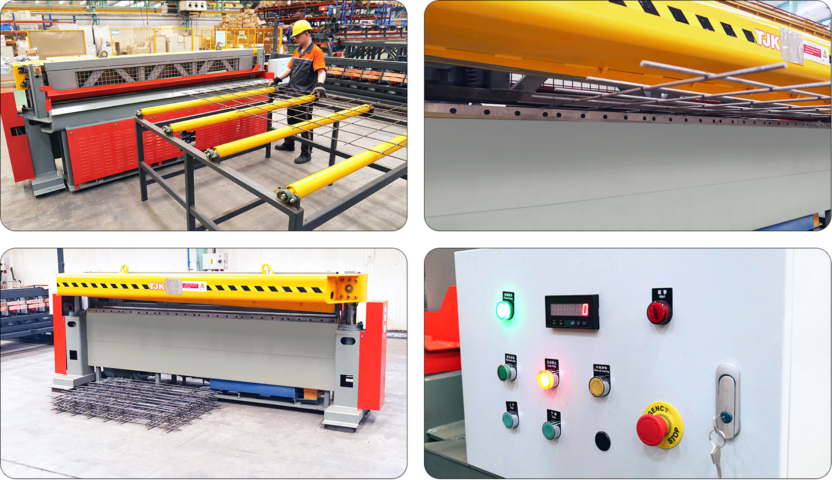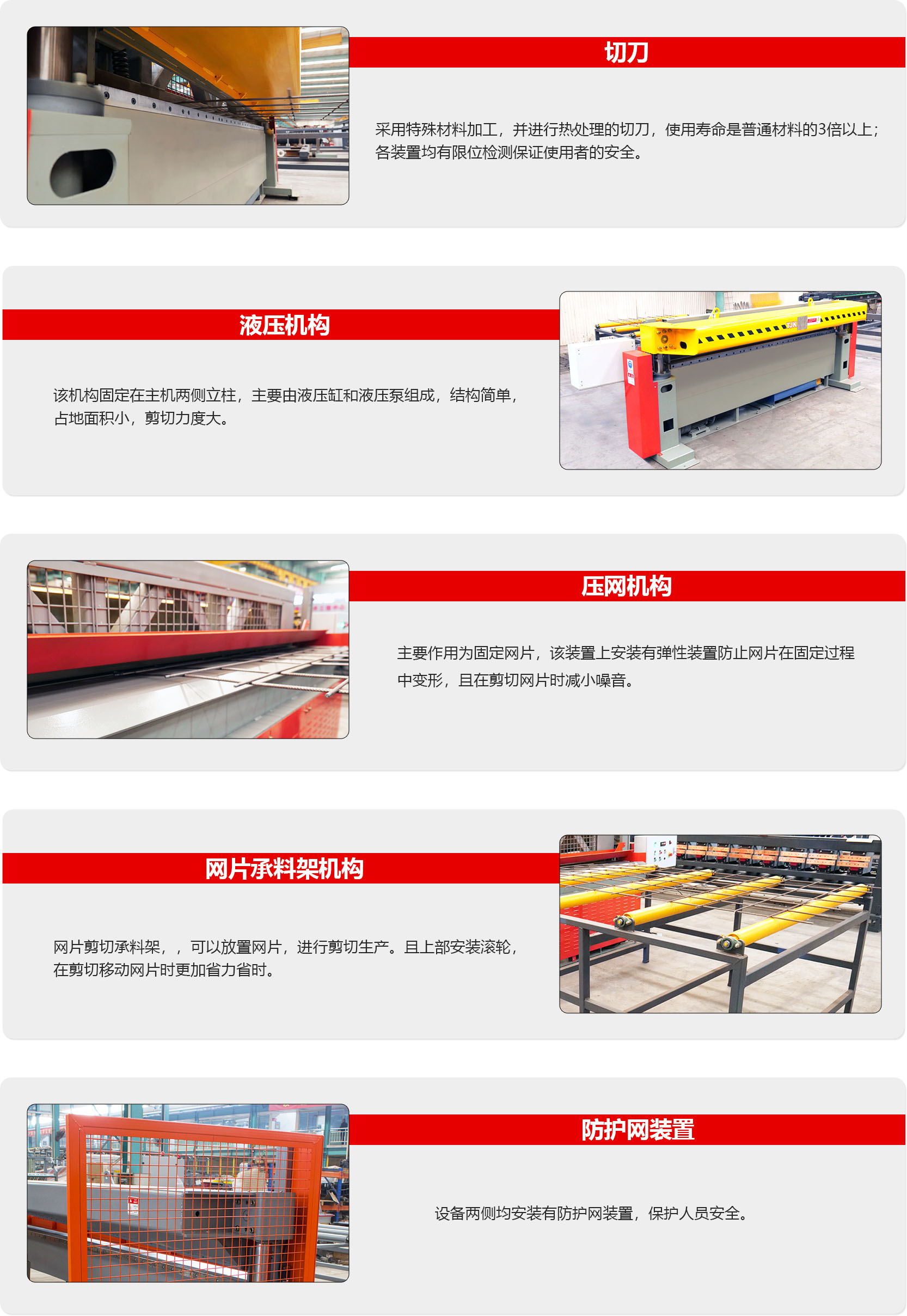 钢筋网片放置剪网支架,经一次快速剪切,剪切后网片落在支架上,实现自动化操作,节能省时,结构简单,工作平稳,生产效率高。最大直径 网格:直径Φ12mm 网格100mm, 剪切宽度:3米/6米。