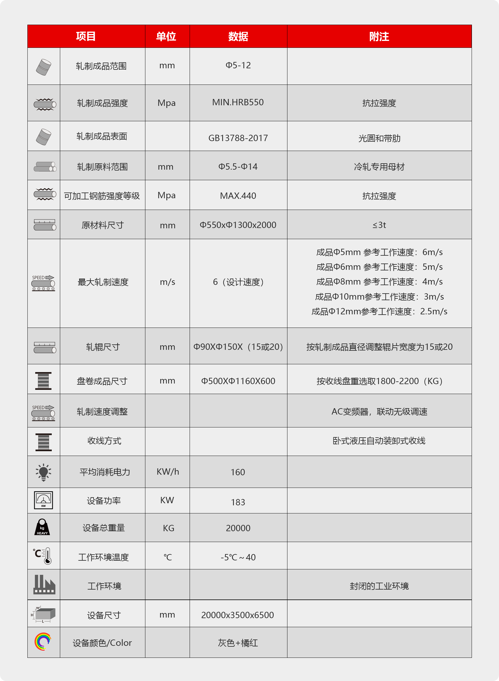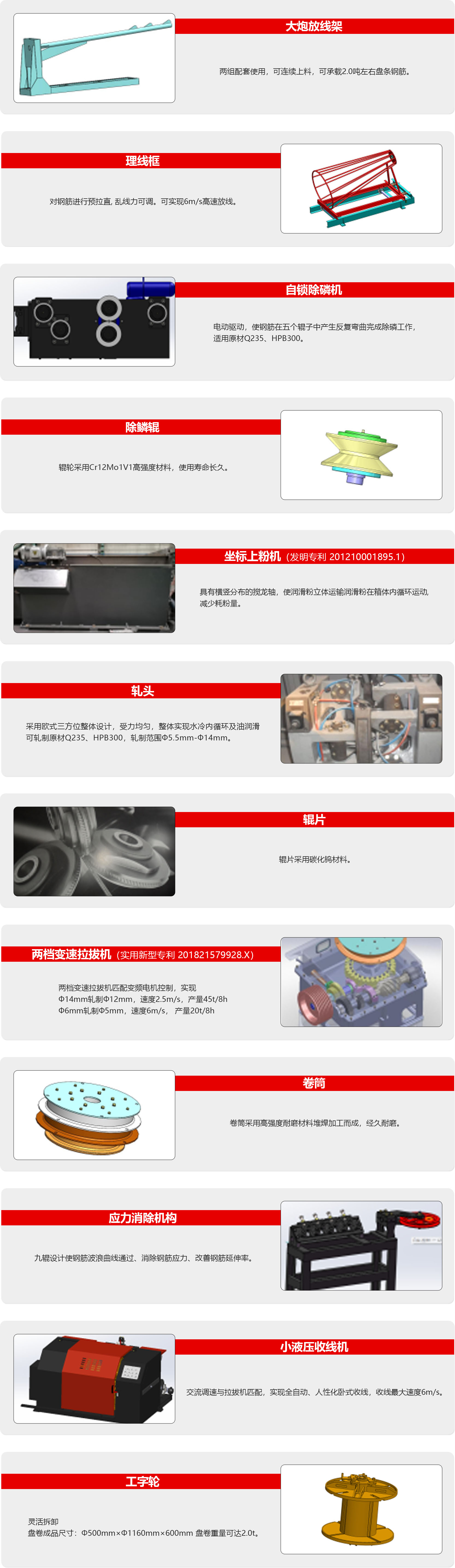 产品介绍:智能冷轧带肋钢筋机器人, 通过对原材料热轧盘圆钢筋(Q235、HPB300)进行轧制,生产出符合CRB550的冷轧 带肋钢筋生产线,具有水平放线、除鳞、润滑、冷轧、拉拔、应力消除及卧式收卷功能。 产品型号描述:LZ-6集水平放线、主机(除磷、上粉、轧头、拉拔)、 卧式收线机于一体,变频电机无极调速,实现最大速度6m/s全自动稳定生产线,轧制钢 筋范围Ф5.5mm-Ф14mm,收取钢筋范围Ф5mm-Ф12mm,设备平均产能高达40t/8h。