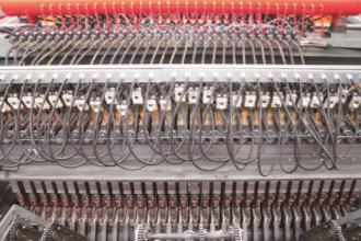 GWCZ3300JZ-F数控钢筋网焊接生产线是主要用于焊接高速铁路,建筑、公路、铁路、核电、基建等用途的网片的焊接设备,该设备可焊接宽度≤3300mm网片,纵筋间距》100mm可自由调节;既可以焊接标准网片又可以焊接开孔网片。纵筋开孔部分采用在线自动剪切装置,实现全伺服控制自动送进与切断。落料采用上、下双层二套落料装置分别落一根长线和二根短线,全自动化的落料结构,将成捆的钢筋放置上去之后不需要人工附助,实现自动落料。