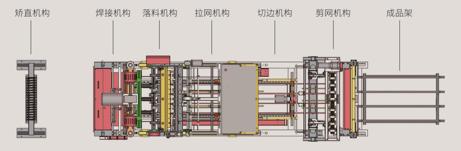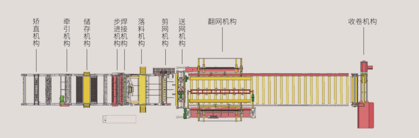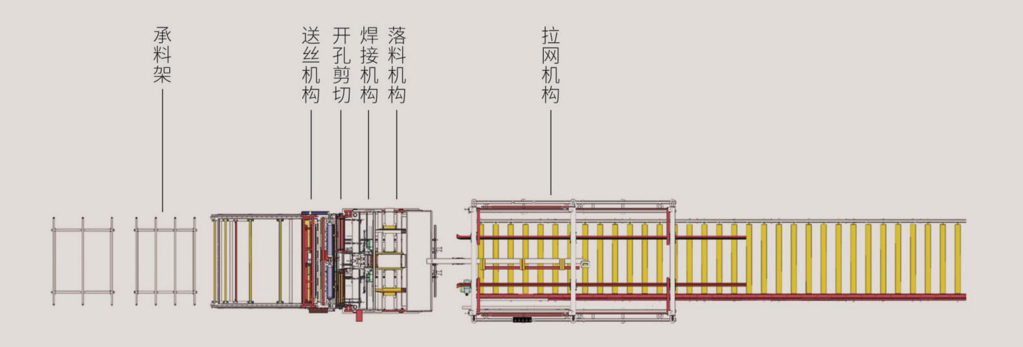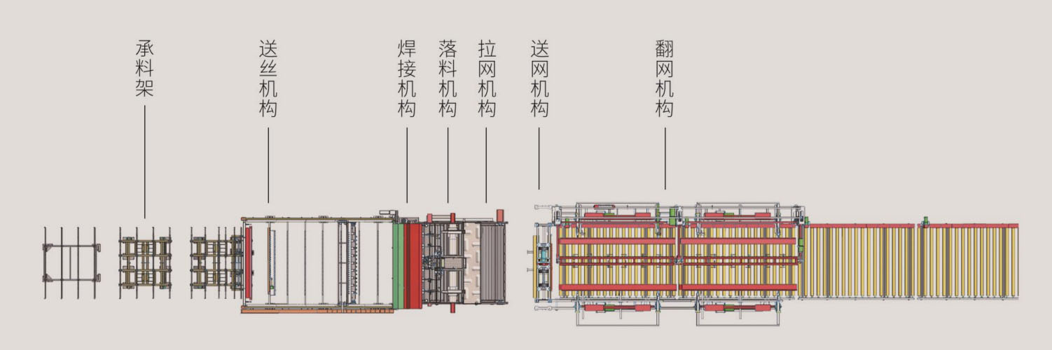 自动升降、伸缩接网机构,可自适应网片的堆码数量,自动调整接网高度,使网片自动摆放整齐,出网轨道实现自动化运行,能自适应的准确自动启动停止,保证整套生产线的工作。
