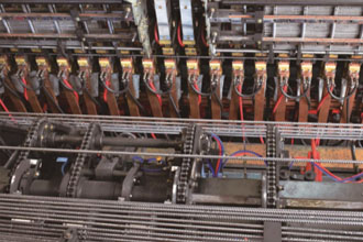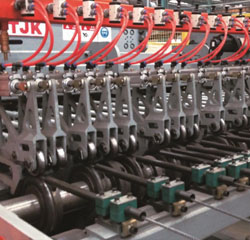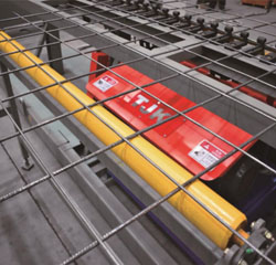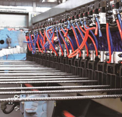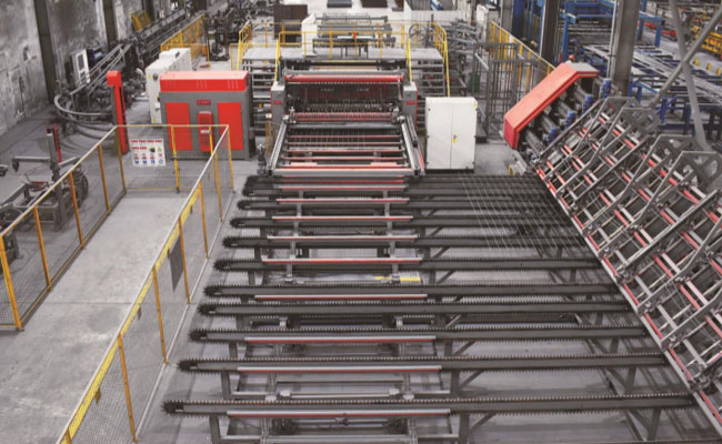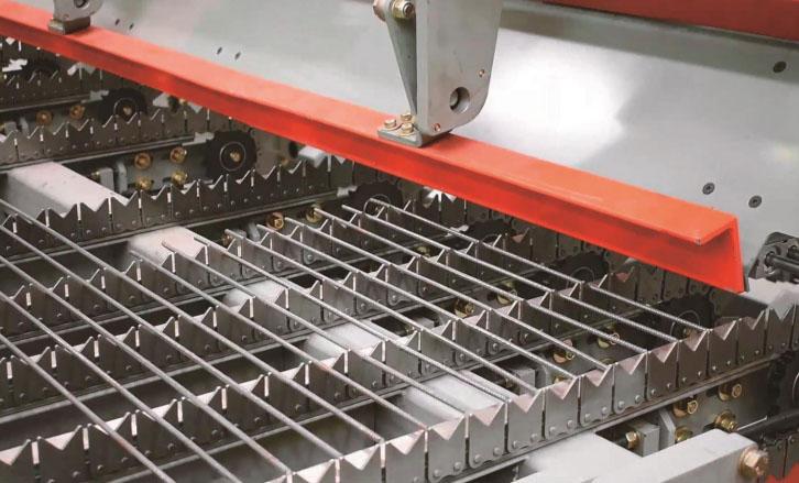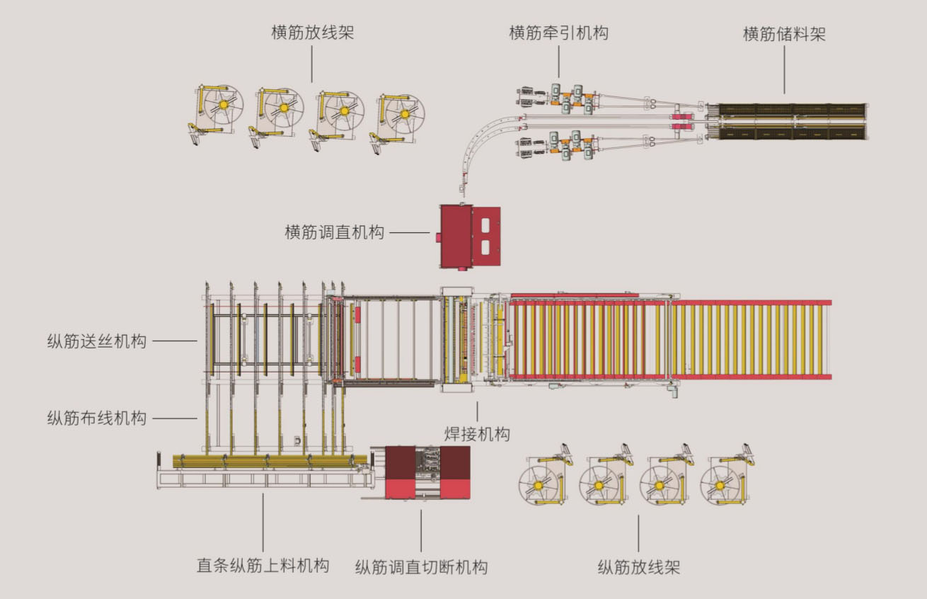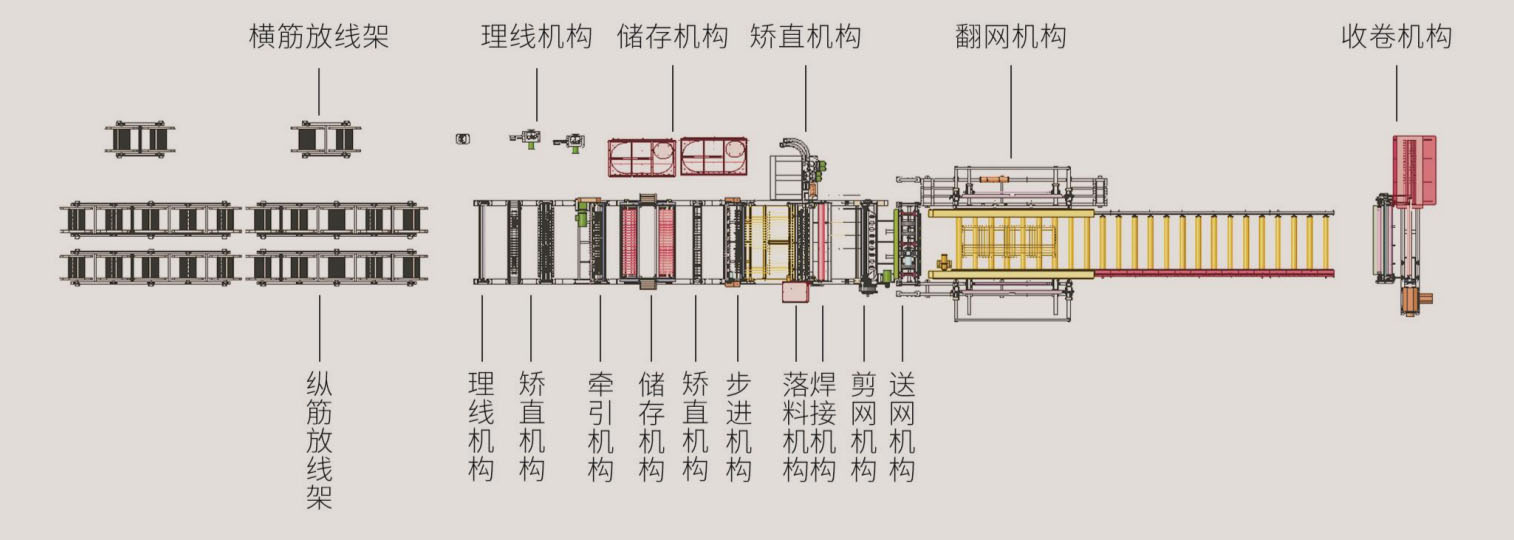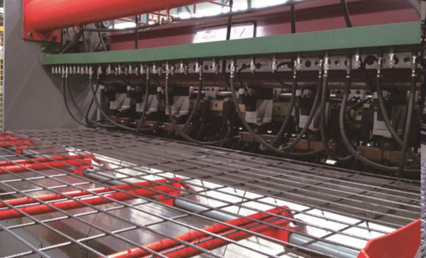 HW-WZD12数控钢筋网焊接生产线采用横筋、纵筋全为盘条上料的方式,可焊接最大网片宽度2800mm,焊接速度可达50-80根横筋每分钟。设备的横筋、纵筋上料机构内部分被配置4组矫直???,分别对应四种不同丝径的钢筋,在使用过程中可根据订单网片规格的需要自动切换;横筋可分别从纵筋的上方、下方输送,焊接成型的网片不需要进行翻转后码放。拉网机构可一次性将十二米长以内的网片拉出,拉出后的网片经过升降接网机构码放,高效率生产。