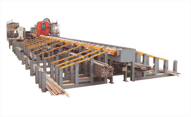 通过步进上料机构配合吊运装置,将主筋、面筋输送到单线输送轨道上,将其输送到单片网成型机上。