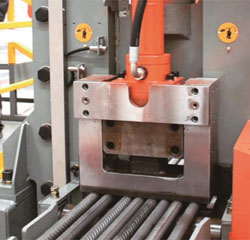 GJW150B数控钢筋液压剪切生产线能够实现对800-12000mm棒材钢筋的定尺剪切需求。定尺机构设有不同长度的定尺挡板,由伺服控制系统调节,可精确控制剪切长度。剪切机构防跳动自动压紧装置不会出现钢筋滑动现象该生产线配合平面网成型机,实现剪切成品、半成品的轨道化传输。