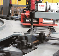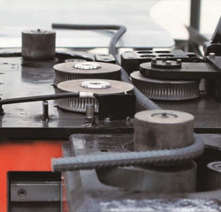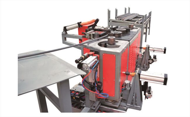 WG12E-2数控钢筋弯箍机采用气动型高效的双工位多功能弯曲机构,生产速度提高20%,可高效的完成各种特殊形状的弯曲,弯曲圆弧角为R6-R35(中心销直径12-70)。大型斜面设计,加工范围大,可加工1670mm以内的各种箍筋,也可加工小至70X70(mm)的小筋。
