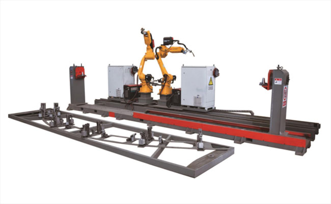 GS1800-6格栅焊接平台由两台在同一轨道上的焊接机器人以及变位机组成,焊接机器人配置激光智能检测装置主要完成格栅各焊接点的焊接工作。生产流程为人工将蝴蝶筋、主筋放入专用模具,通过龙门和银道完成线上流转,完成格栅焊接生产。