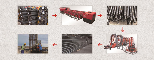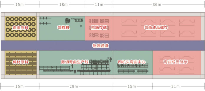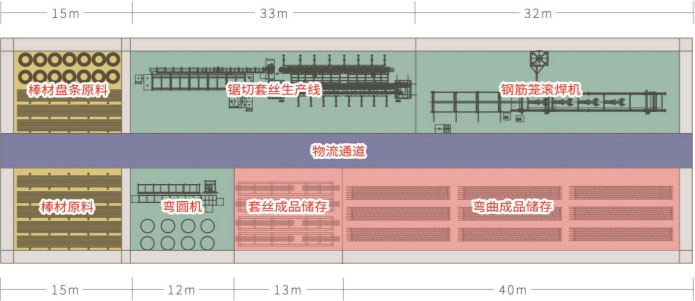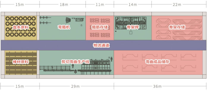 钢筋加工中心长80米,宽26米,采用4m宽行车道,将厂区划分为原料存放区、生产加工区、半成品储存区。配置数控钢筋弯箍机、棒材钢筋勇切弯曲生产线、数控钢筋锯切套丝生产线、数控钢筋笼滚焊机等国内先进的自动化数控设备,可大幅提高生产效率,有效控制成品质量,减少生产线人工数量,降低劳动作业强度,降低现场管理难度和安全风险。