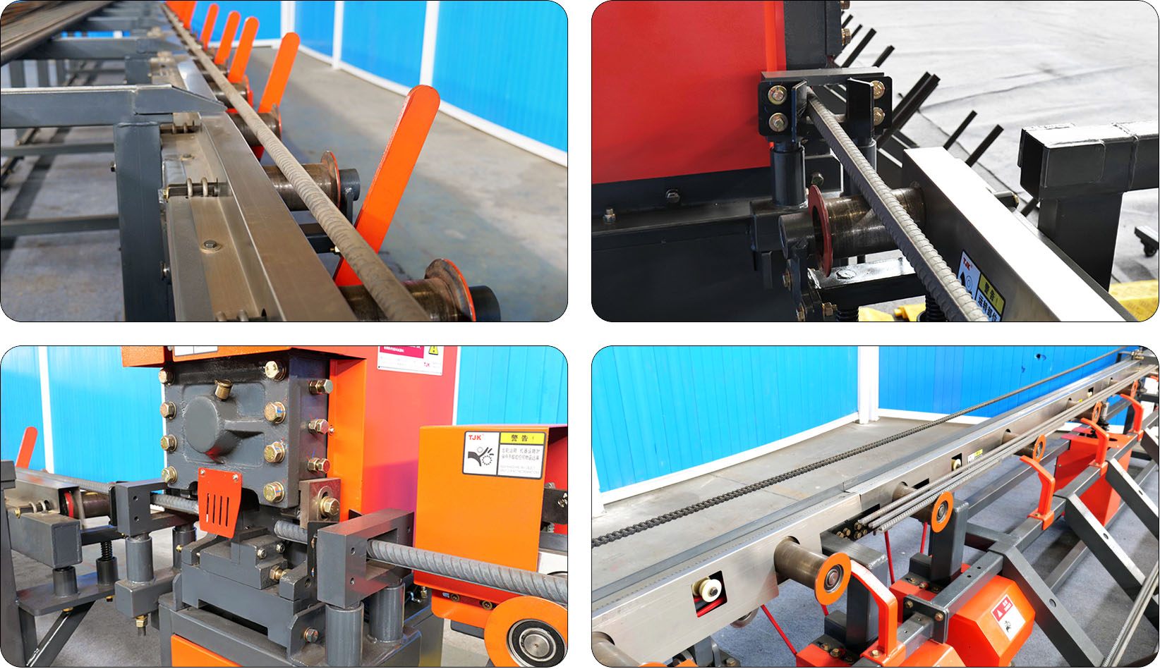 该设备用于将直条钢筋进行高质量的定尺剪切、输送、存储的生产线。包括钢筋原材 上料架,钢筋前后输送,钢筋定尺,钢筋切断,储料仓,电控机构。该设备切断定尺精准、 操作简单、故障率低。是钢筋剪切不可缺少的加工设备。