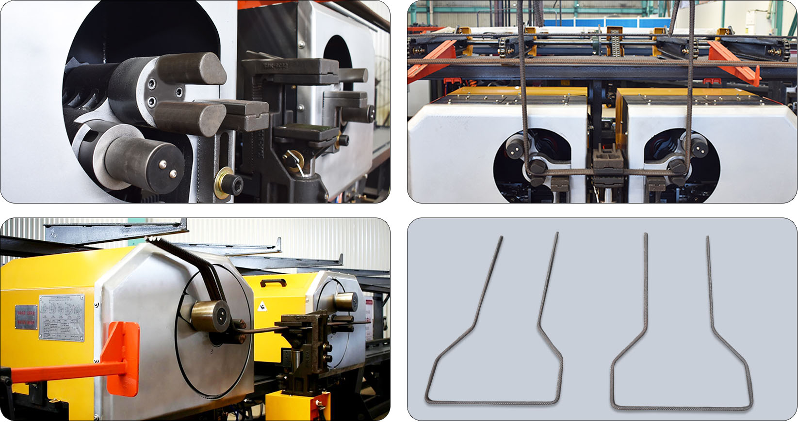 本产品将定尺切断后的钢筋弯曲成正方形、矩形、板筋、U形筋等不同形状的设备。可实现双向同时弯曲钢筋,自动化程度高,操作简便易行。该设备的特点是速度快,实用,可靠,非常受国内、外客户的信赖与青睐,具有强大的信息化拓展能力,图形储存能力,内置常用钢筋图形,触控操作面板调整、设置十分便捷。
