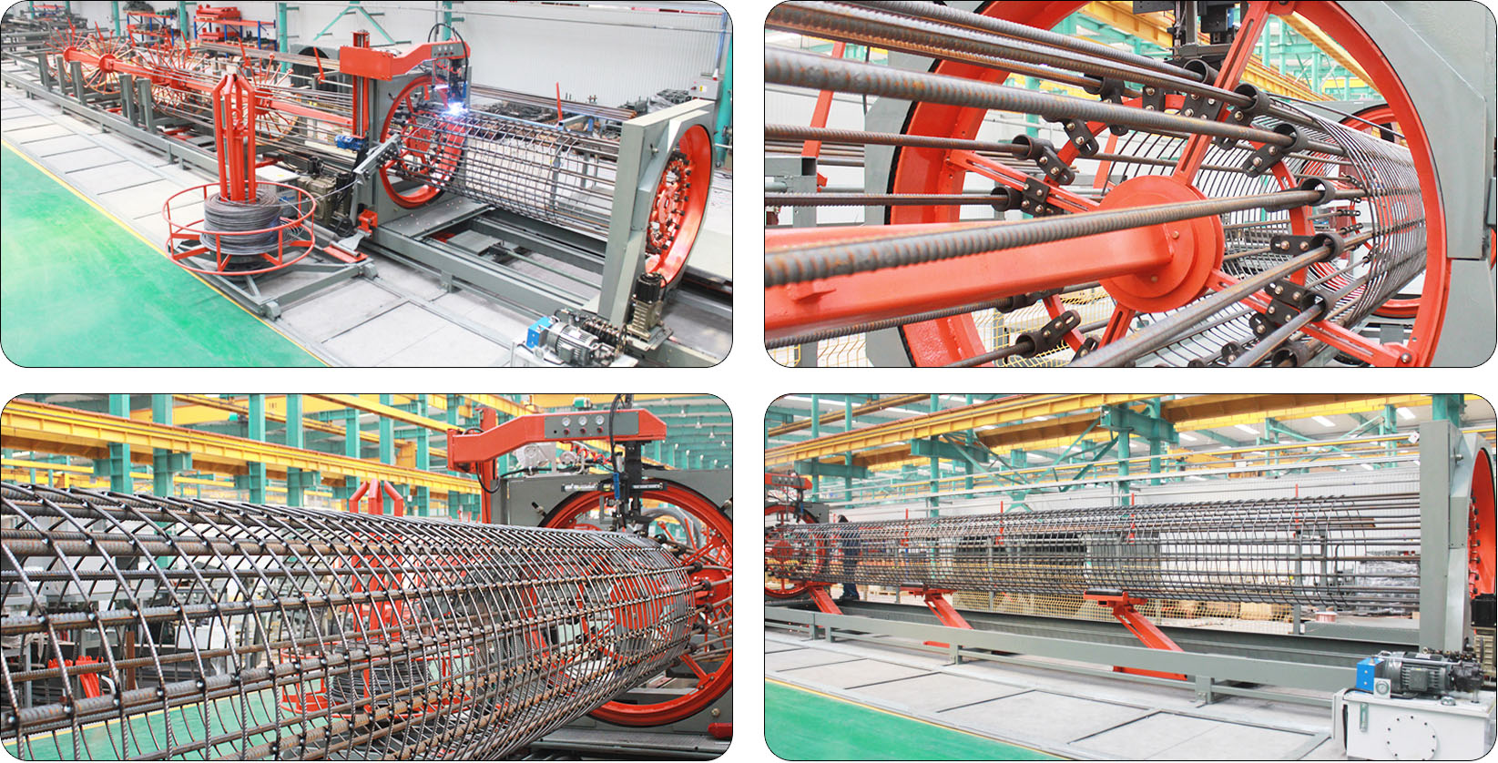 该设备可根据客户的需要配备相应的模圈或者圆盘,将盘条或者直条箍筋螺旋缠绕并焊接在主筋外侧,实现不同规格的钢筋笼的自动化生产,产量大、精度高、变换规格方便、操作故障率低、节能性强、消耗低、质量高。