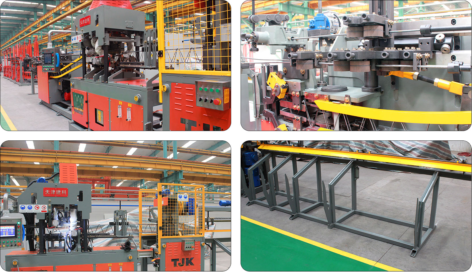 该设备用于将5根规定范围直径的冷/热轧光圆或带肋钢筋,从五个盘条的原料开始, 经过盘条放线、钢筋调直、腹杆筋折弯、自动焊接成型、自动剪切、自动收集为一体的全 自动化生产线,最终的成品为截面呈三角形的钢筋桁架制品,主要用于叠合板用钢筋骨架 和PC预制构件;整条生产线由1人员操作,1人辅助即可。最大生产速度为10m/min。日 产能(生产时间按10H),大约3000m。 该设备的特点是稳定性、装机功率小、使用成本低。