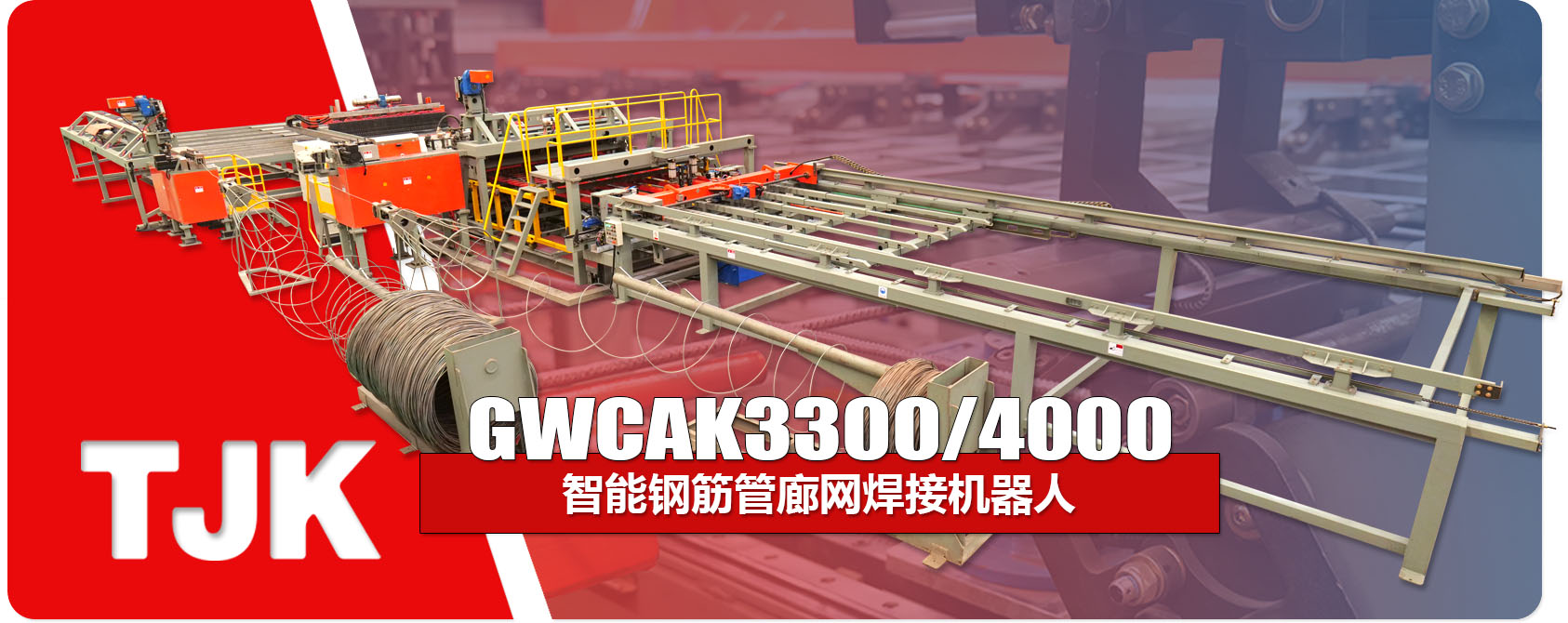智能钢筋管廊网焊接机器人GWCAK系列根据开孔网焊网机的技术要求,满足客户的使用性能特开发CAD图纸解析软件,成功将CAD图纸转换成DXF格式并完整解析图纸数据(包括网片的尺寸,横筋与纵筋的长度,横纵筋的间距,网片重量,抽头留尾尺寸等,清晰可见,一目了然)控制方式可多轴通讯并实现多轴同时运动及差补控制。其性能大幅度提高,同时使用更加简单,具有自动诊断,显示故障位置,代码,诊断包括总线节点的故障通讯,电源故障,以及现场装置及连接件的短路,短路故障,从而使设备的维护人员可以通过故障提示迅速发现系统的故障位置和状态。整条生产线由1人员操作,1人辅助即可。产能,大约1800平方米/小时(150*150mm网格 8mm螺纹钢筋,长3*2.5米)。